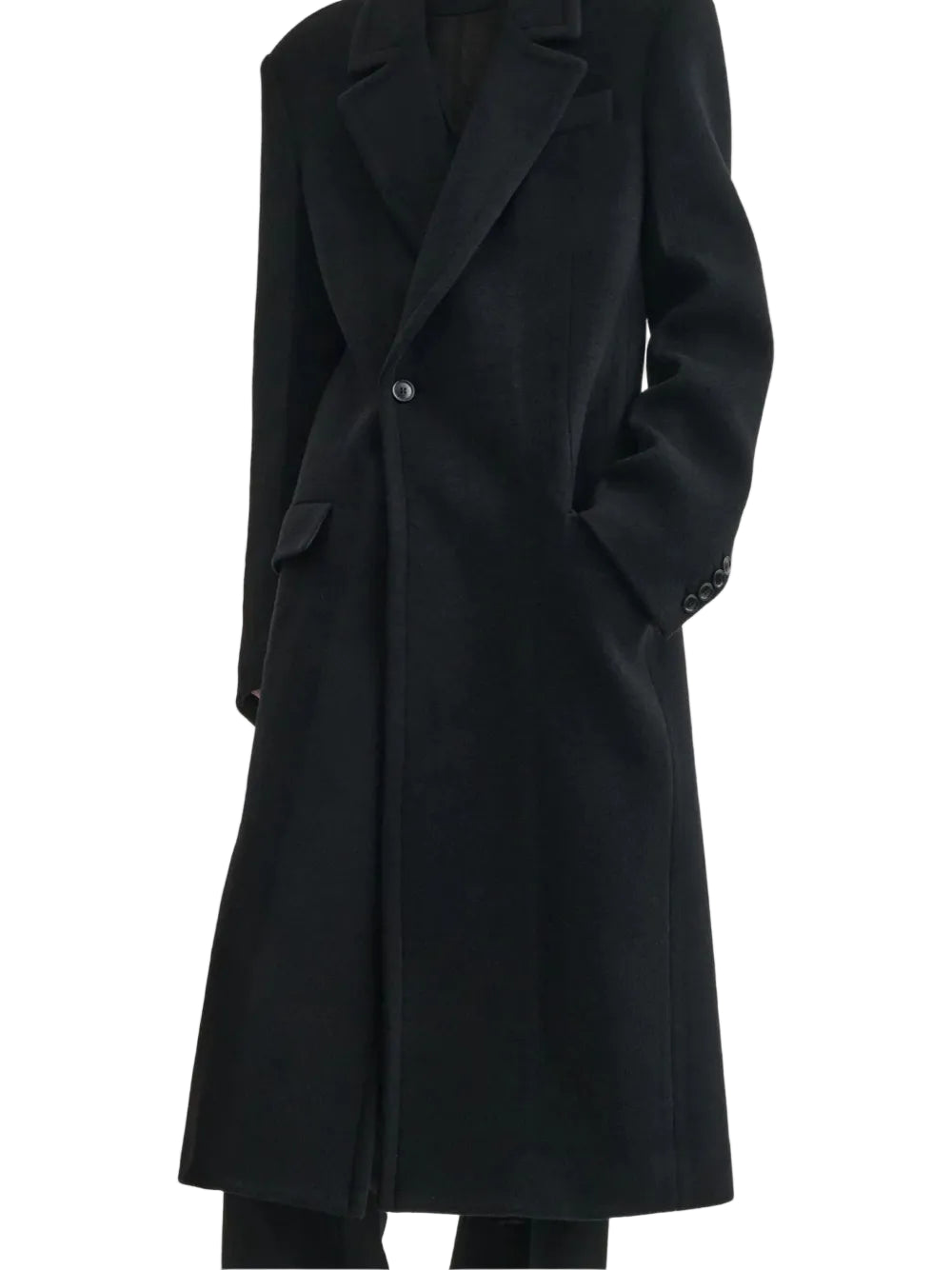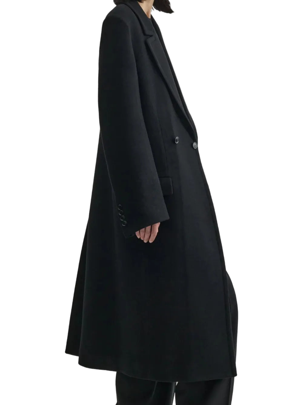 HighlightsBlackDouble-breastedButtoned cuffsNotched lapelsFront flap pockets