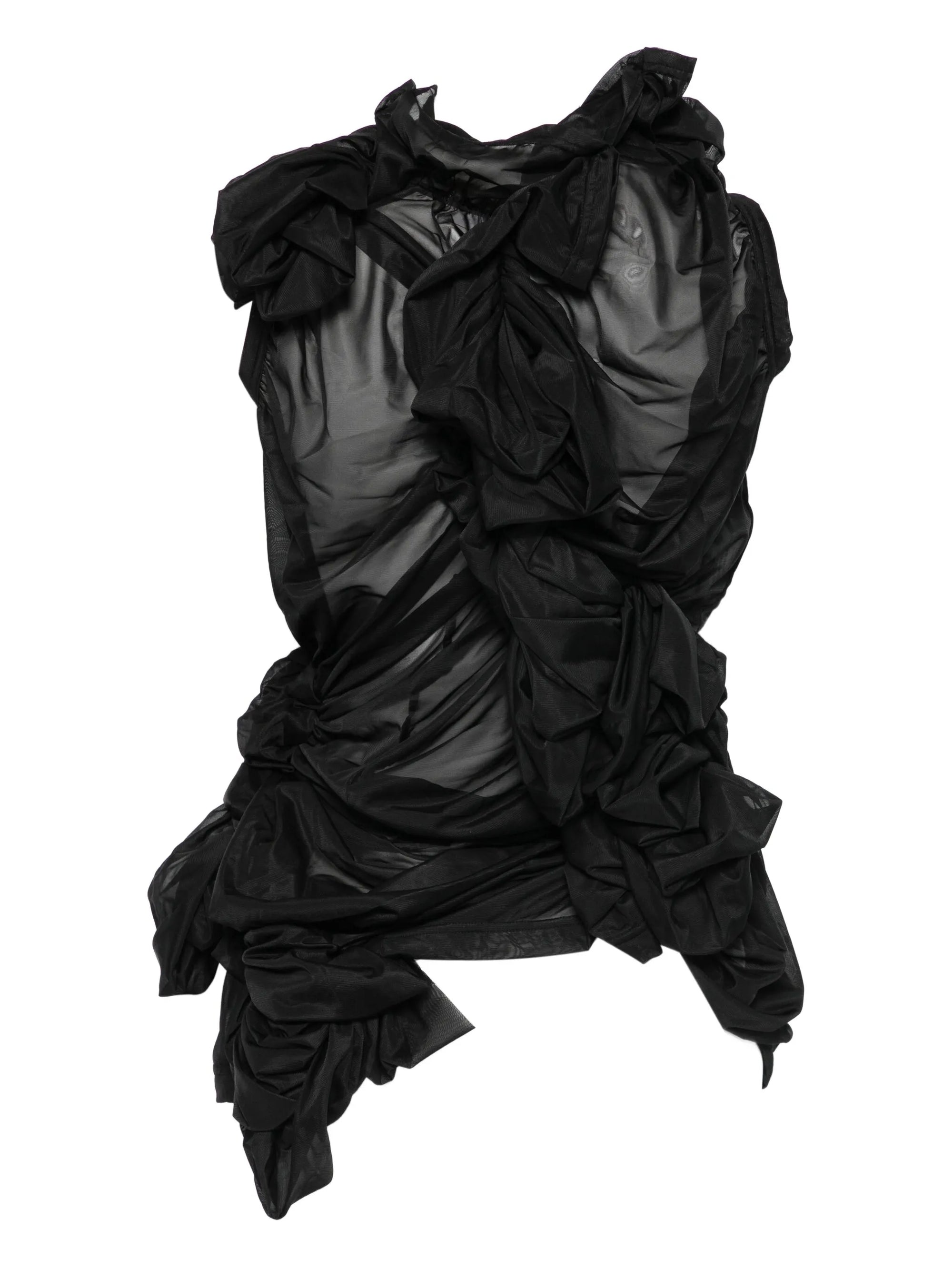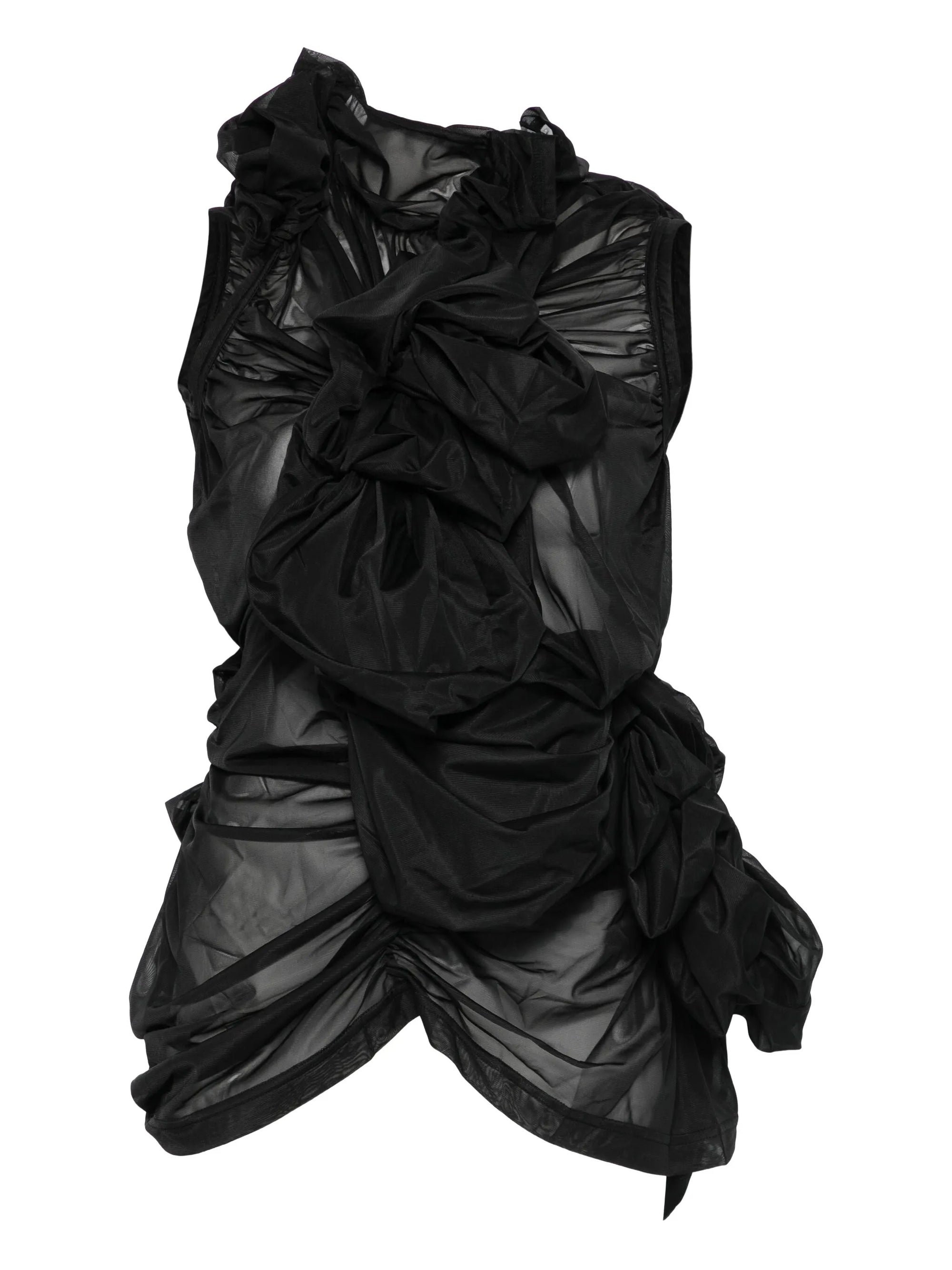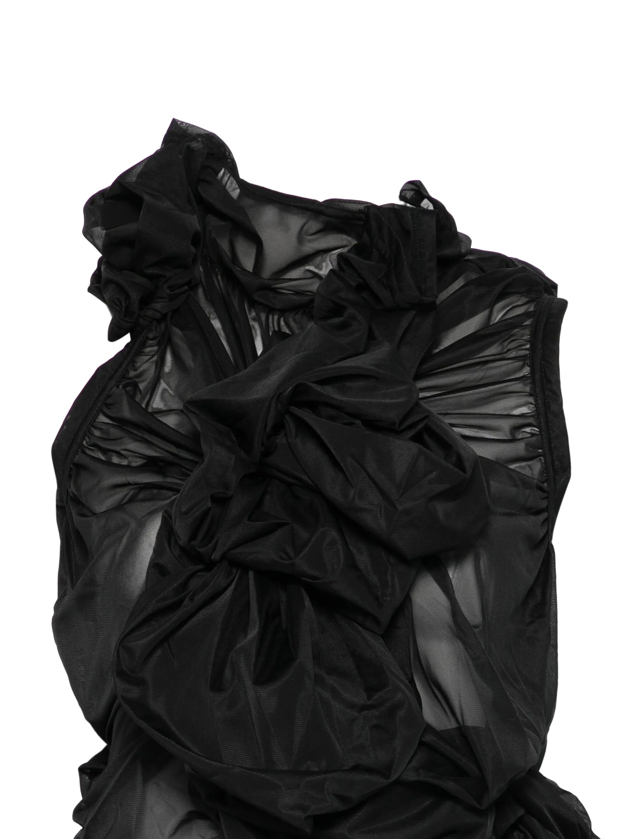 HighlightsBlackSheer finishRuffled detailingSleevelessGathered detailingHigh neck