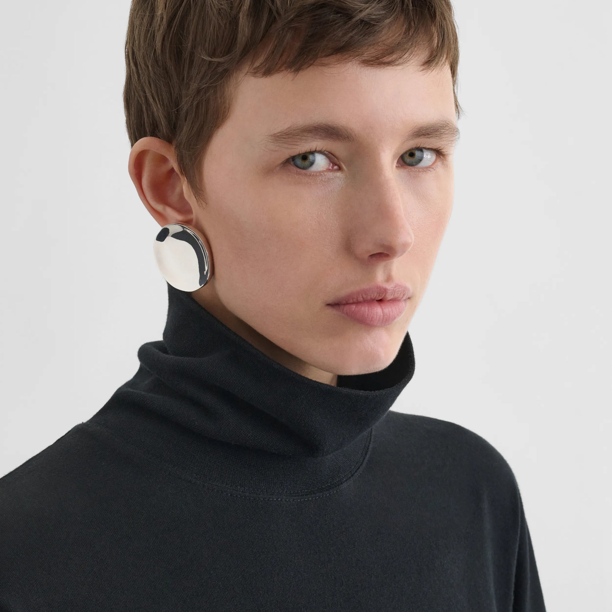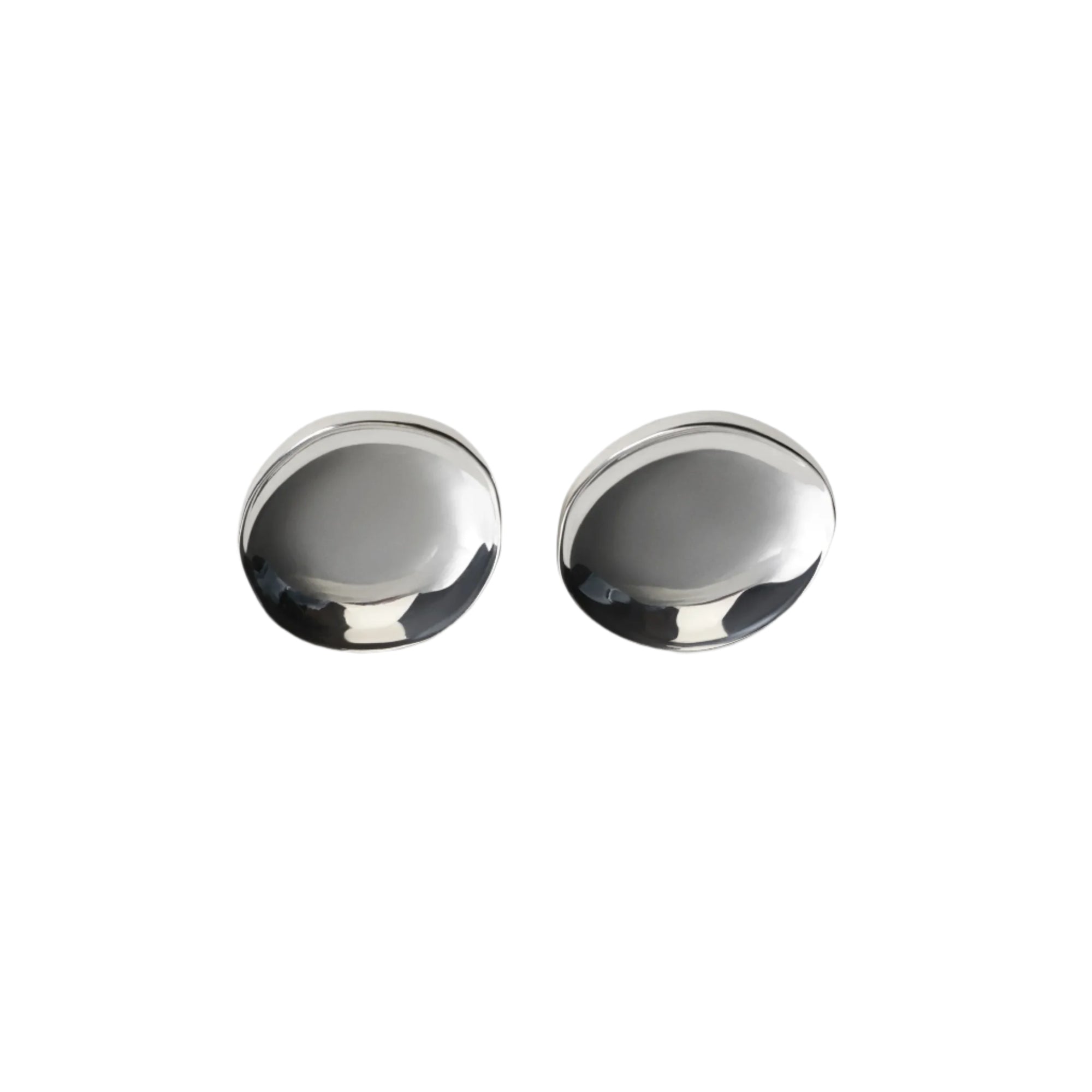 The Medallion Dish Earrings in silver feature a sculptural, concave design that catches light with subtle shimmer. Crafted from polished sterling silver, their bold yet refined shape adds a modern, artistic touch to any ensemble—perfect for elevating both everyday and evening looks.