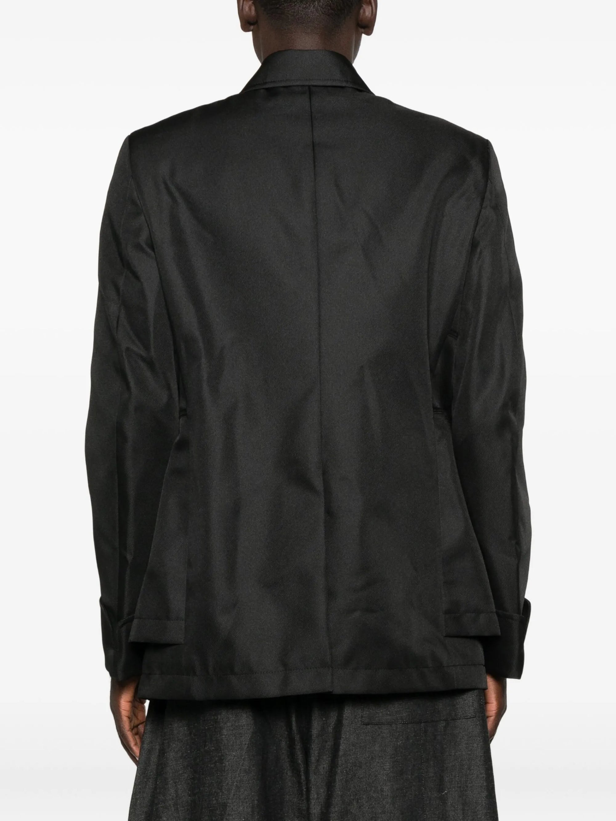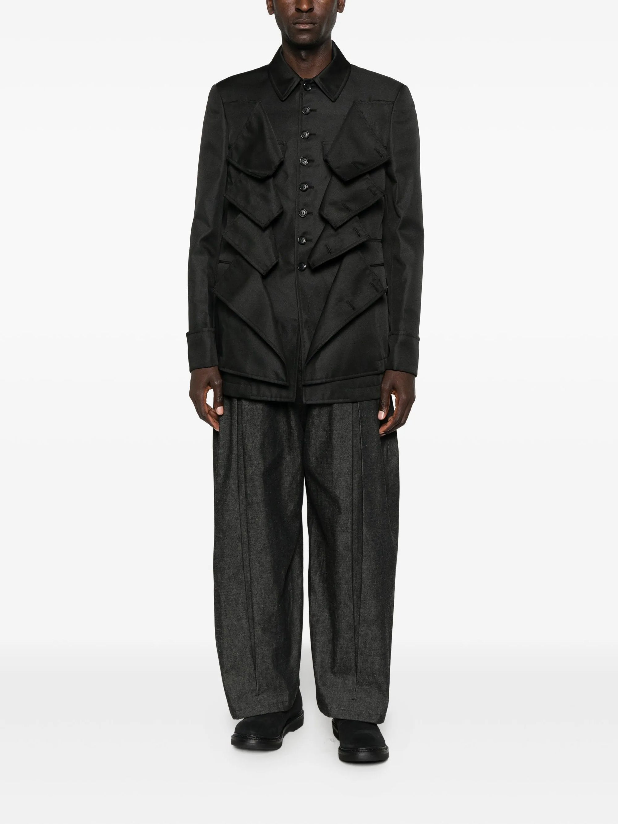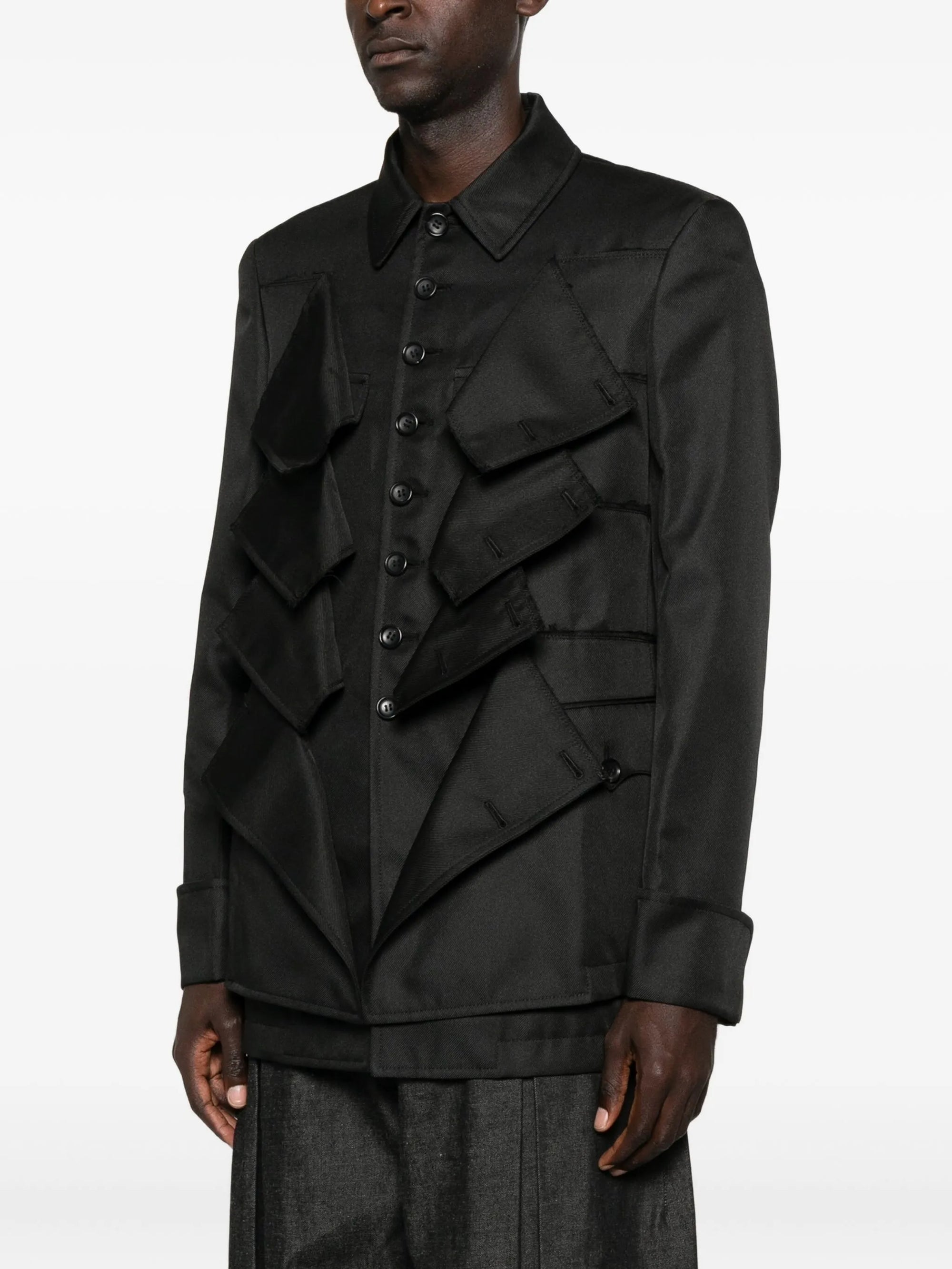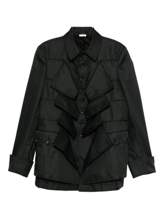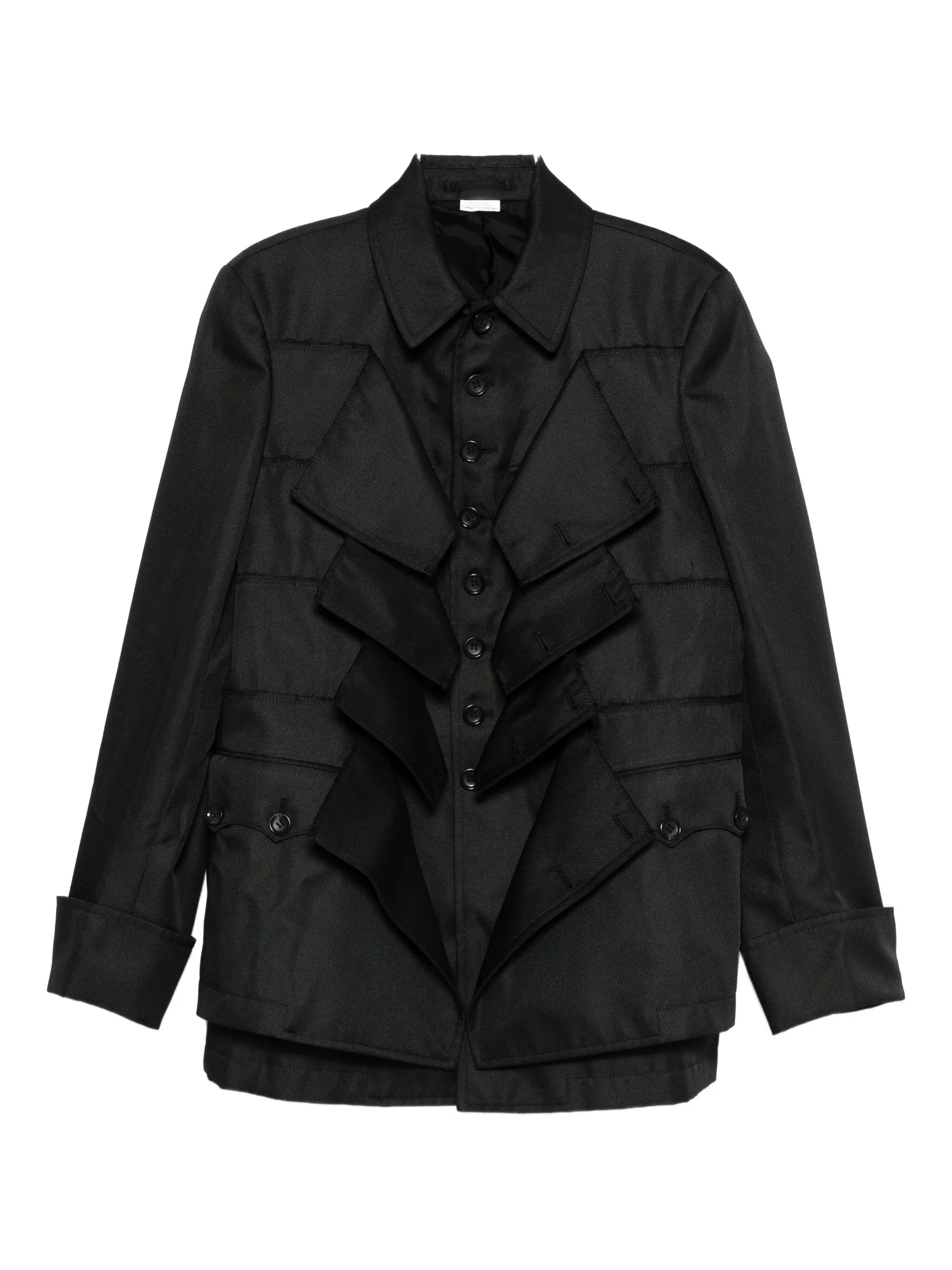 HighlightsBlackLayered flap detailingButton fasteningPoint collarLong sleevesButtoned cuffs
