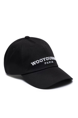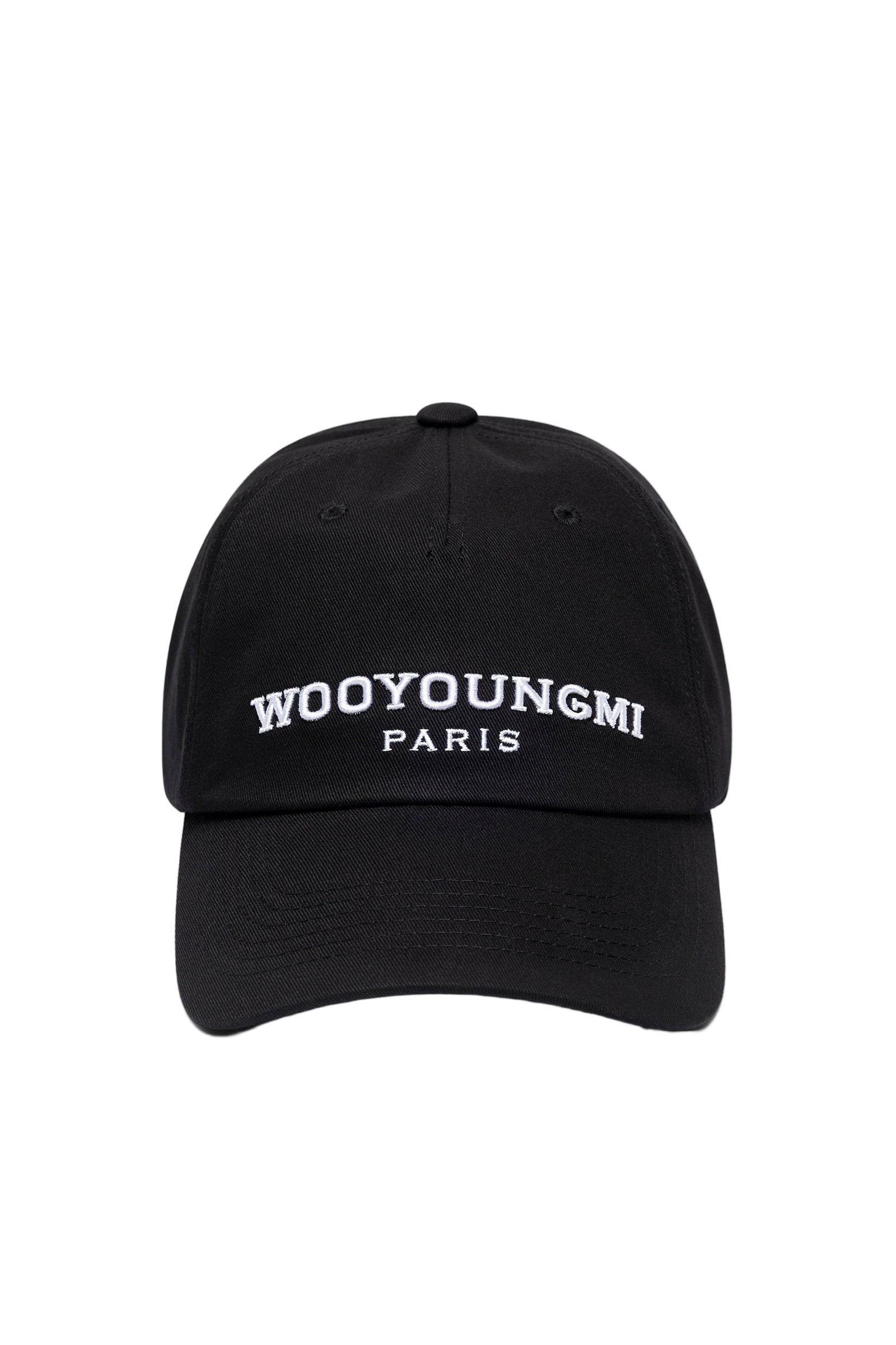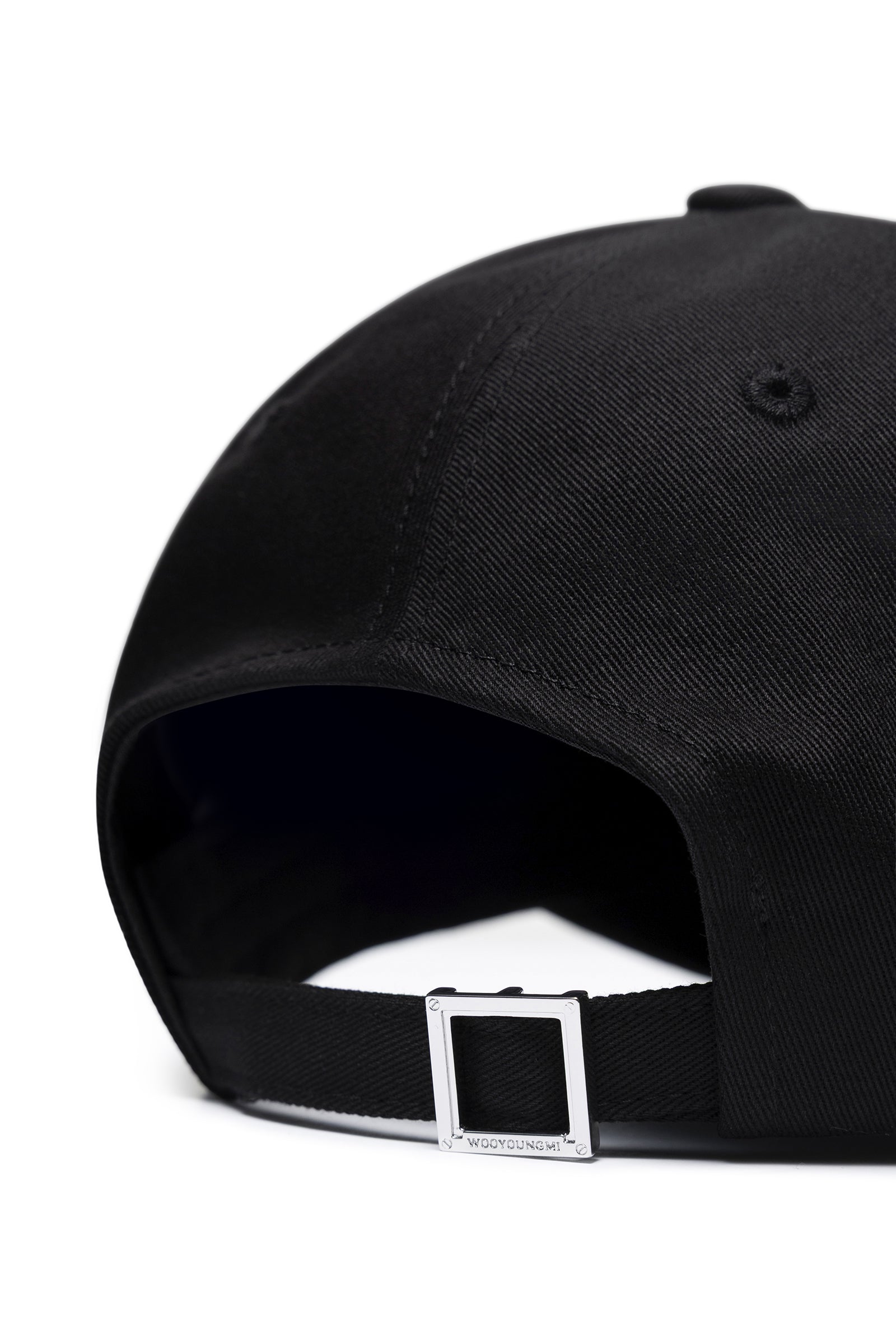 Made from durable cotton twill, this black WOOYOUNGMI ball cap features a classic six-panel construction with tonal stitching and an adjustable back strap. The front is finished with subtle embroidered branding, offering a refined touch to a casual essential.