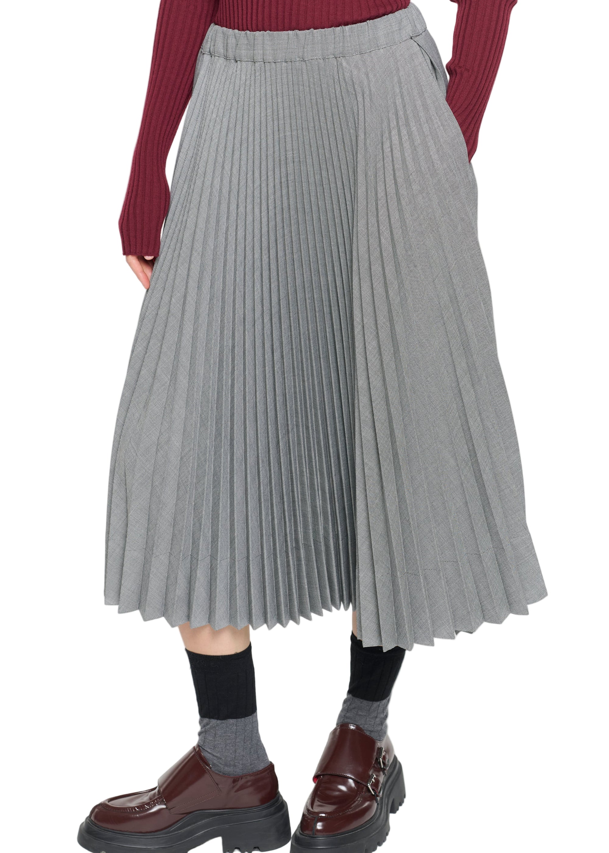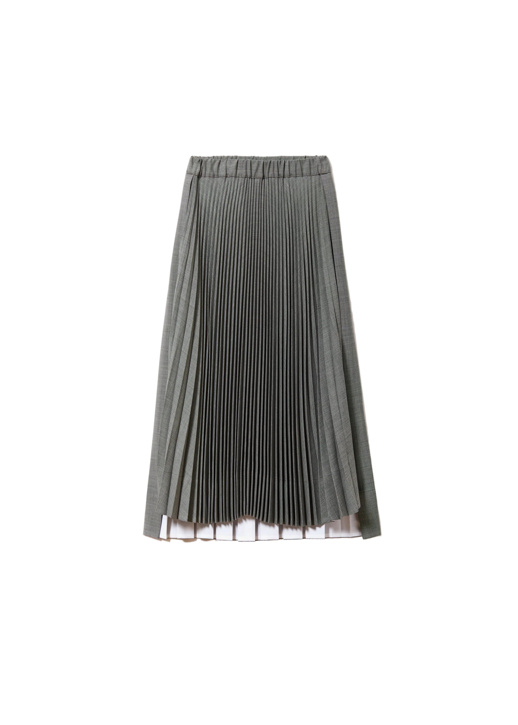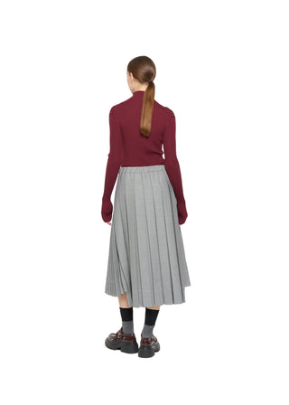 Plan C’s asymmetric pleated skirt is crafted from lightweight, flowing fabric for a fluid, elegant silhouette. Featuring finely pressed pleats and a subtly uneven hem, it combines modern architectural detailing with classic femininity, creating a versatile piece that elevates both casual and formal ensembles.