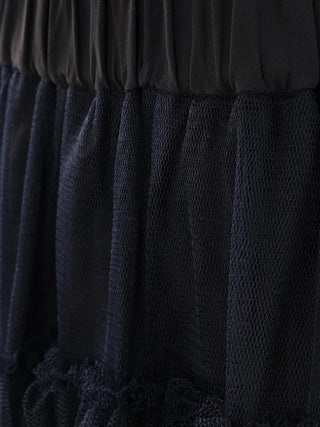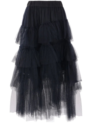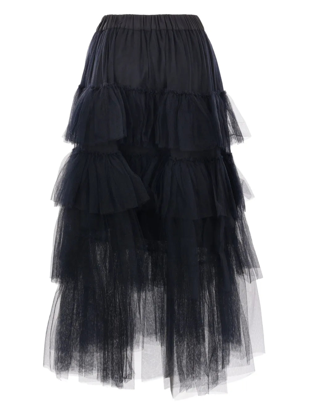 HighlightsBlackElasticated waistbandAsymmetric designTiered skirtTulle nettingHigh-waisted