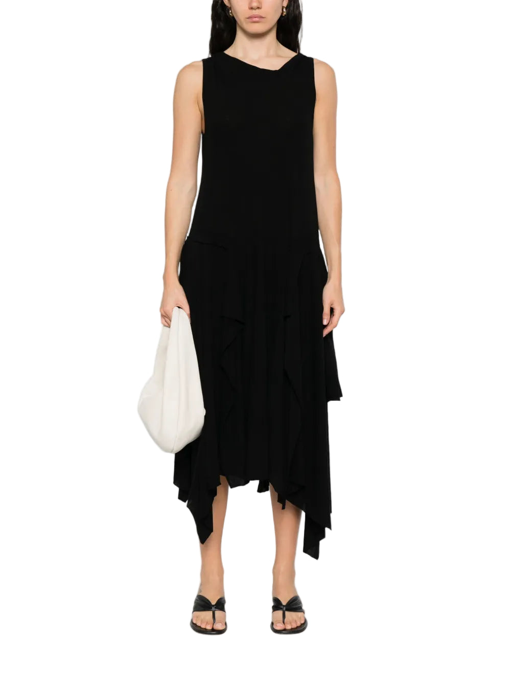 A sculptural, single-strap sleeveless dress expertly crafted from draped wool gabardine (or rayon twill), with an elegant asymmetrical neckline and slender shoulder strap. The fluid silhouette skims the body while offering volume and movement, finished in deep neutrals. Minimalist yet dramatic—perfect for layering or standing alone.