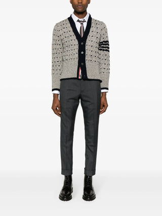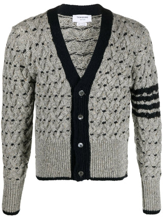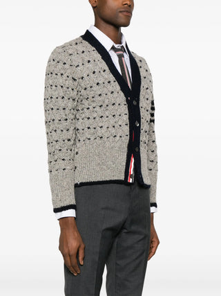 Thom Browne expands upon its range of sophisticated, preppy knitwear with this grey cardigan. Spun from wool and mohair in a chunky cable-knit construction, it boasts a V-neck silhouette framed by black trim. It is adorned with a horizontal dotted pattern and a signature 4-Bar stripe at the sleeve.