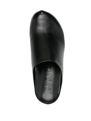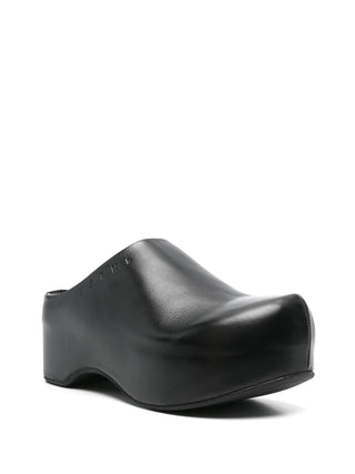 HighlightsBlackLeatherSlip-on style75mmPlatform wedgeEmbossed logo to the sideAlmond toeBranded leather insole