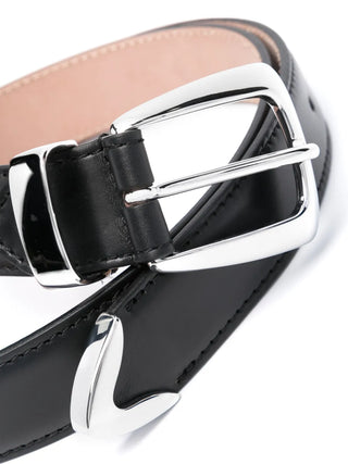 HighlightsBlackCalf leatherSmooth grainSilver-tone hardwareBuckle fasteningPunched holesPointed tipAdjustable fit