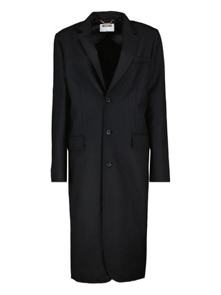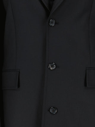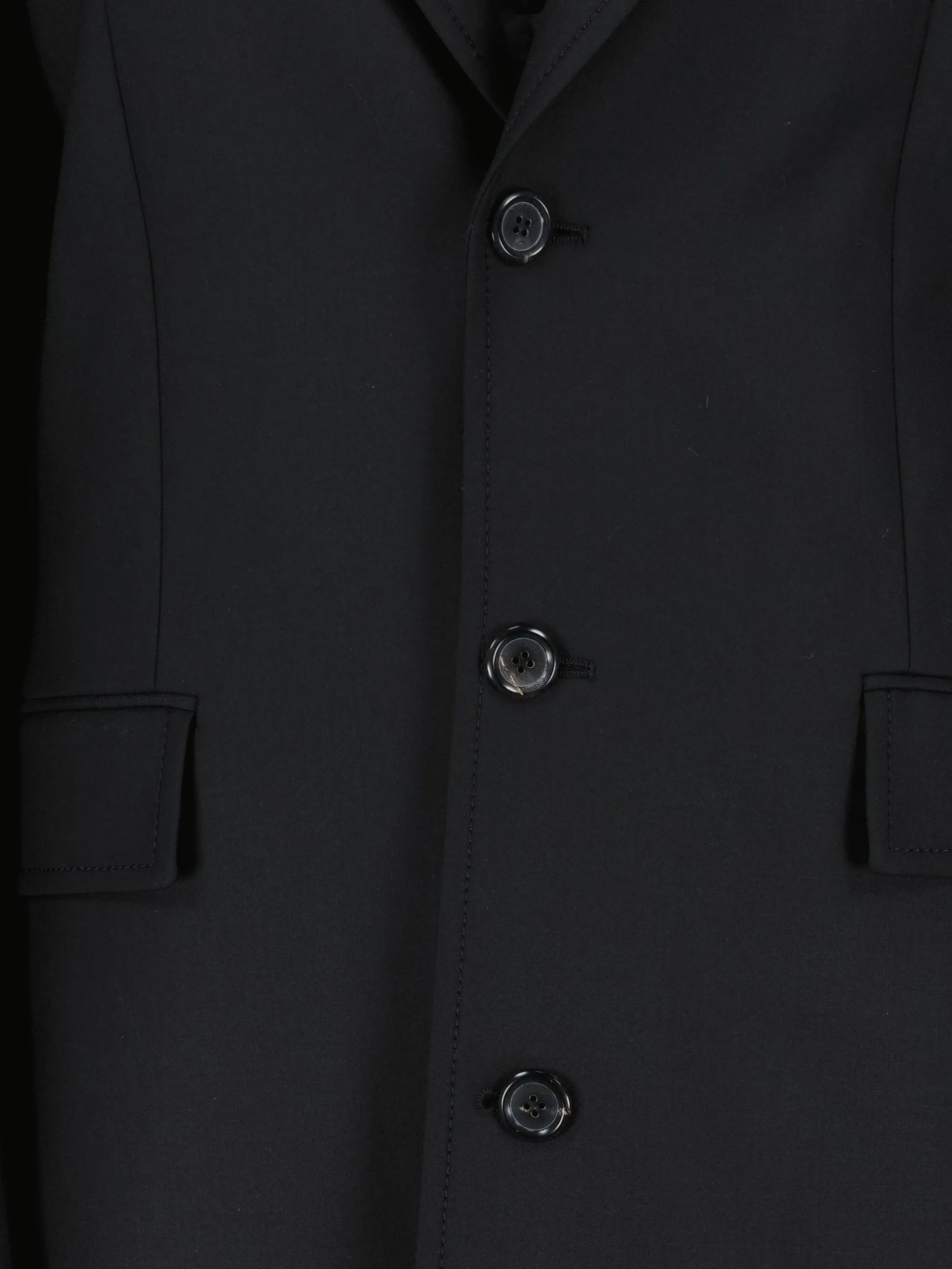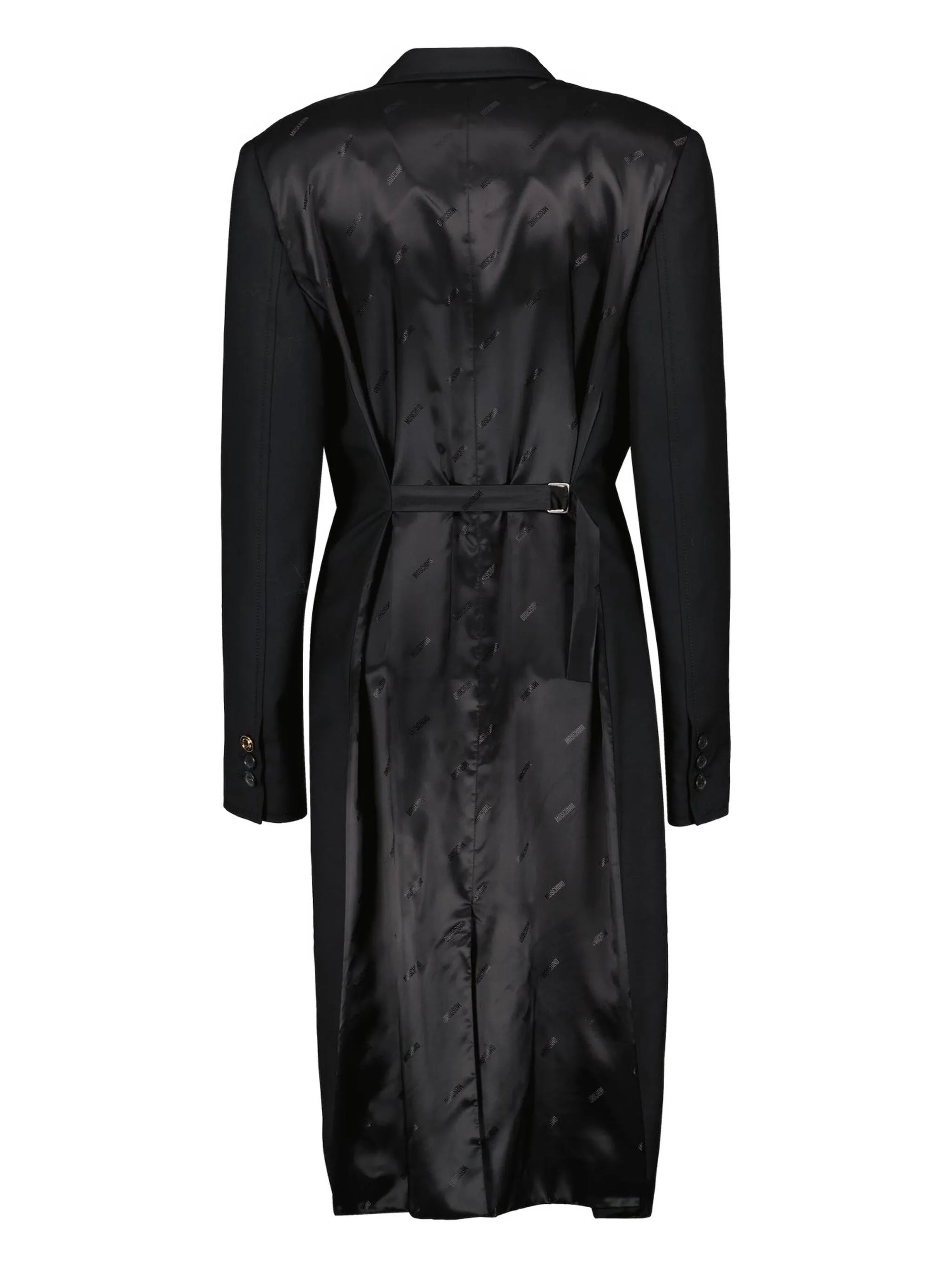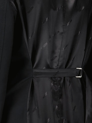 HighlightsBlackSatin backButton fasteningWelt pocketsLong sleevesBelted waist