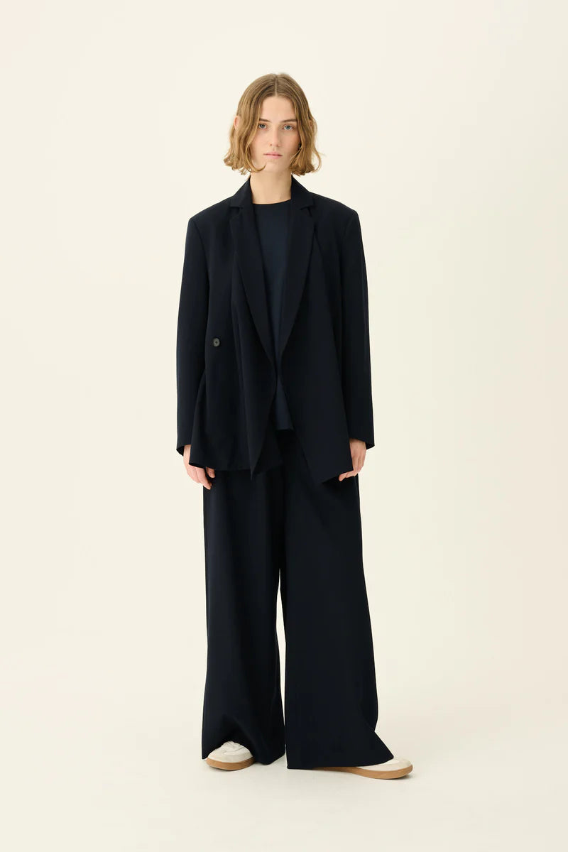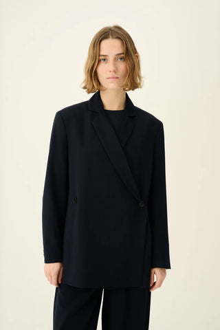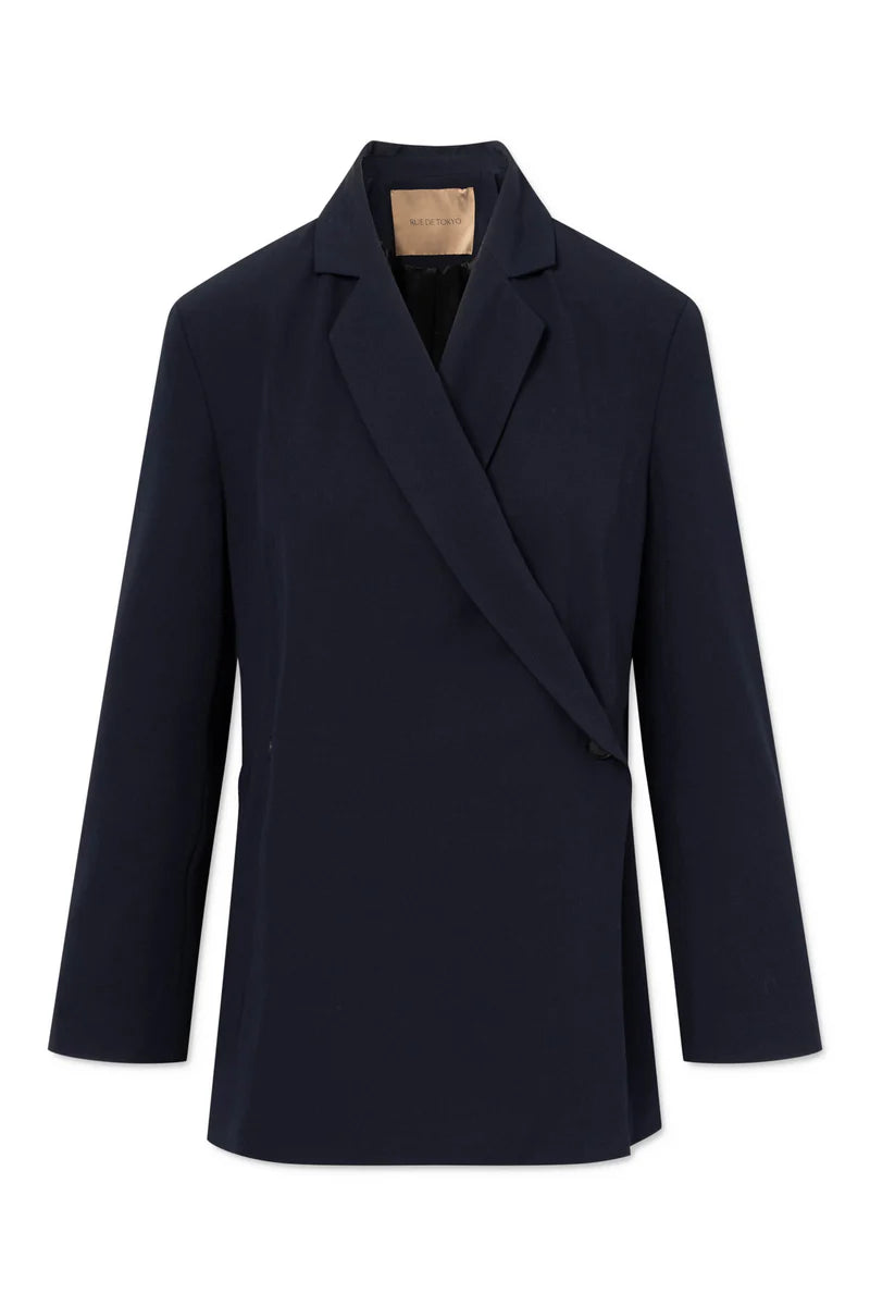 Discover the CHIYO Solid Tailoring blazer in a sophisticated navy hue, perfect for any occasion. This double-breasted women's blazer from Rue de Tokyo's Autumn/Winter collection offers a blend of timeless style and modern design.