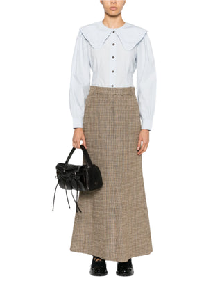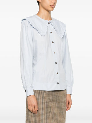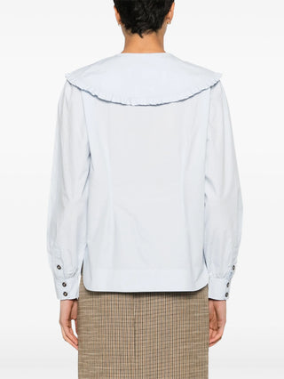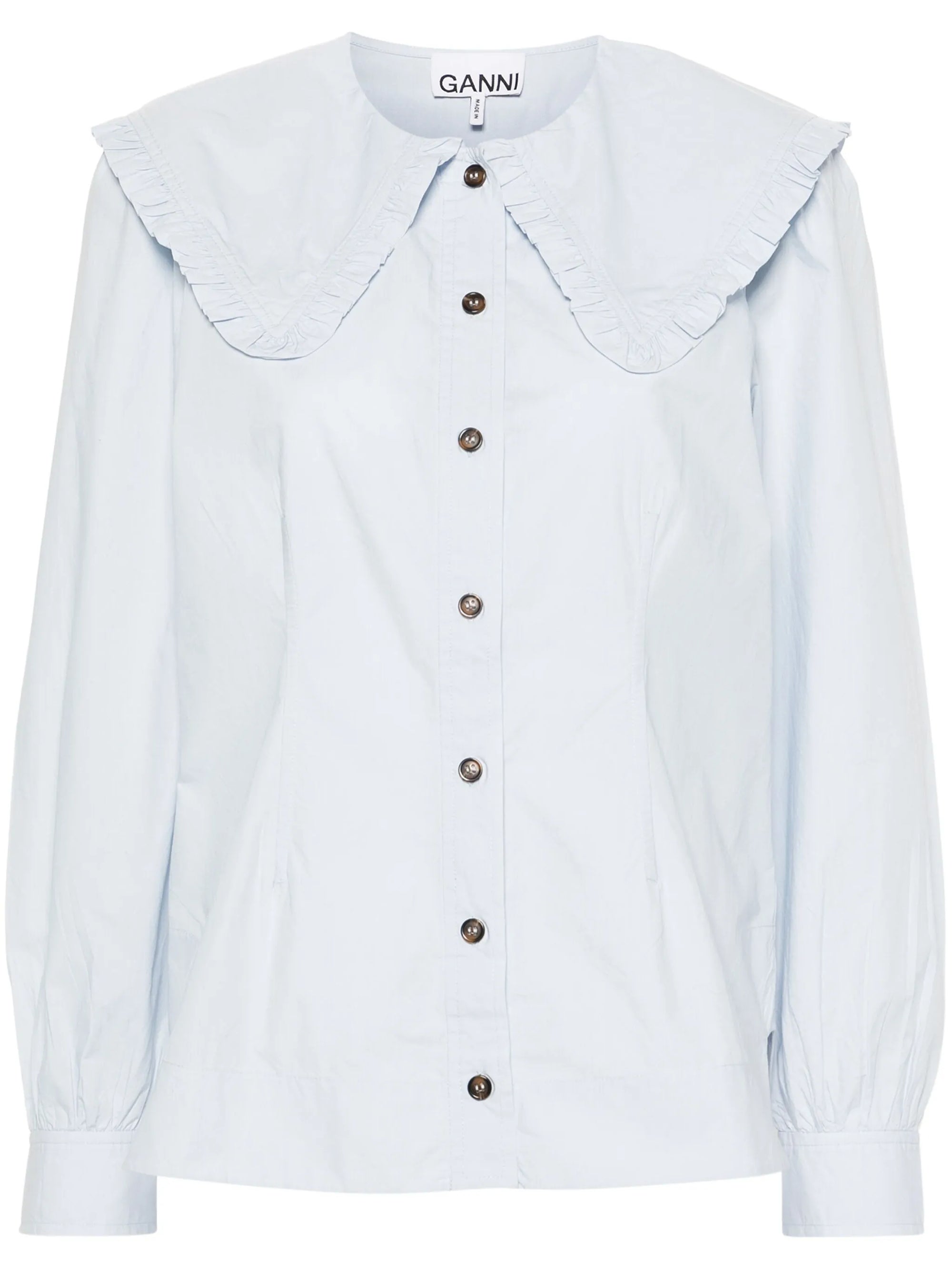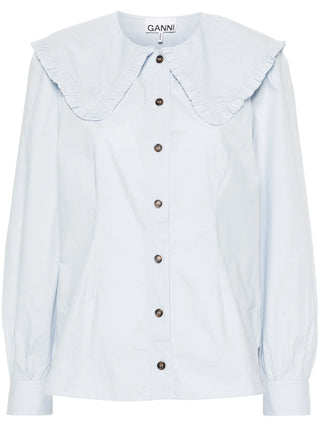 Highlights:Light blueOrganic cottonWide neckPoplin textureRuffled edgeLong sleevesButtoned wristsCurved hemButtonhole on the front