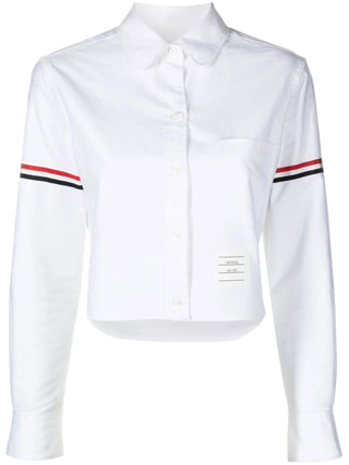 Ivory white cotton rounded collar front button fastening stripe detailing logo patch to the front long sleeves buttoned cuffs cropped