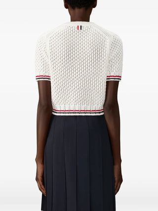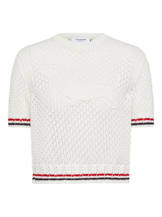 HighlightsWhitePointelle designDog motifStriped trimShort sleevesRound neck