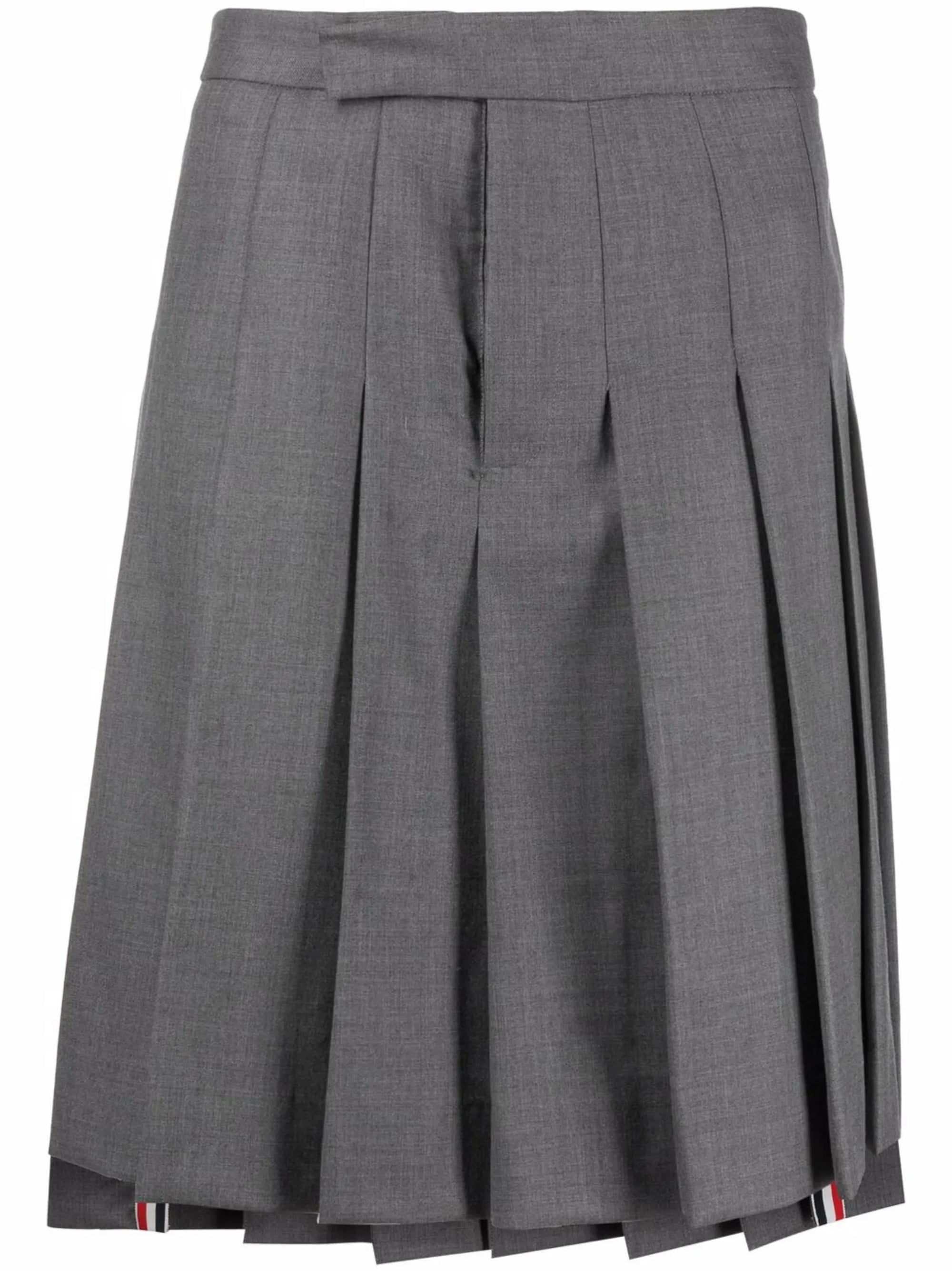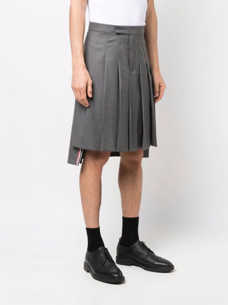 Renowned for its androgynous approach to garments, Thom Browne includes this medium grey skirt on its SS22 collection, Spun from wool in Italy, this piece is cut for a tailored fit, evoking the brand's heritage and craftsmanship, and is given a modern appeal with a high-low hem and signature RWB motif.