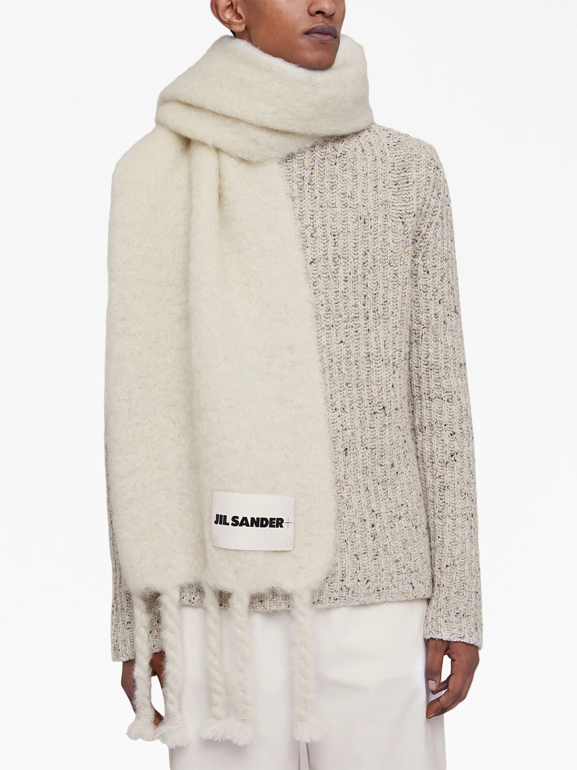 HighlightsCream whiteMohair-wool blendKnitted constructionChunky knitFringe detailingLogo patch to the frontWraparound style