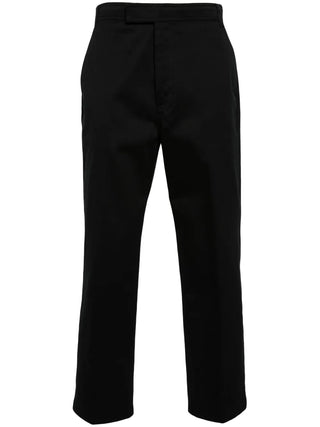 HighlightsBlackCottonTwill weavePressed creaseMid-riseBelt loopsConcealed front fasteningTwo side slit pocketsTwo rear welt pocketsTapered leg
