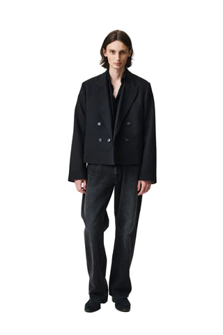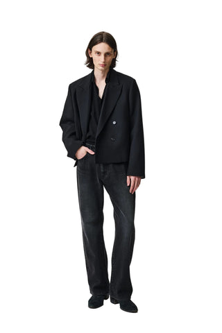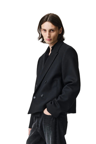 Men’s oversized coat cut short and double buttoned featuring subtle vertical double velt pockets
