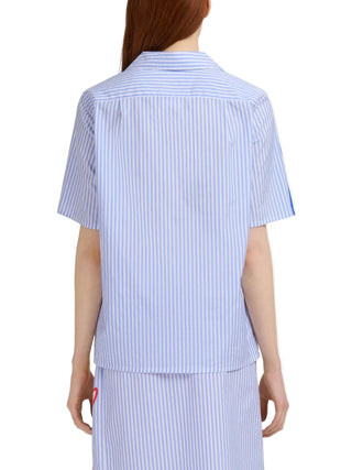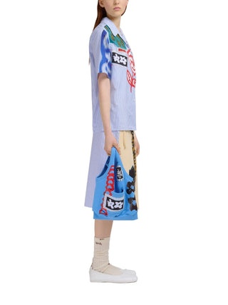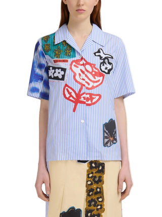 HighlightsLight blueStriped patternFloral and graphic appliquésButton fasteningRelaxed collarContrasting patche