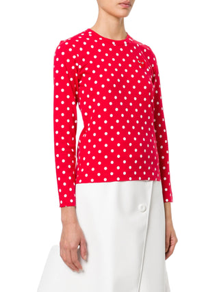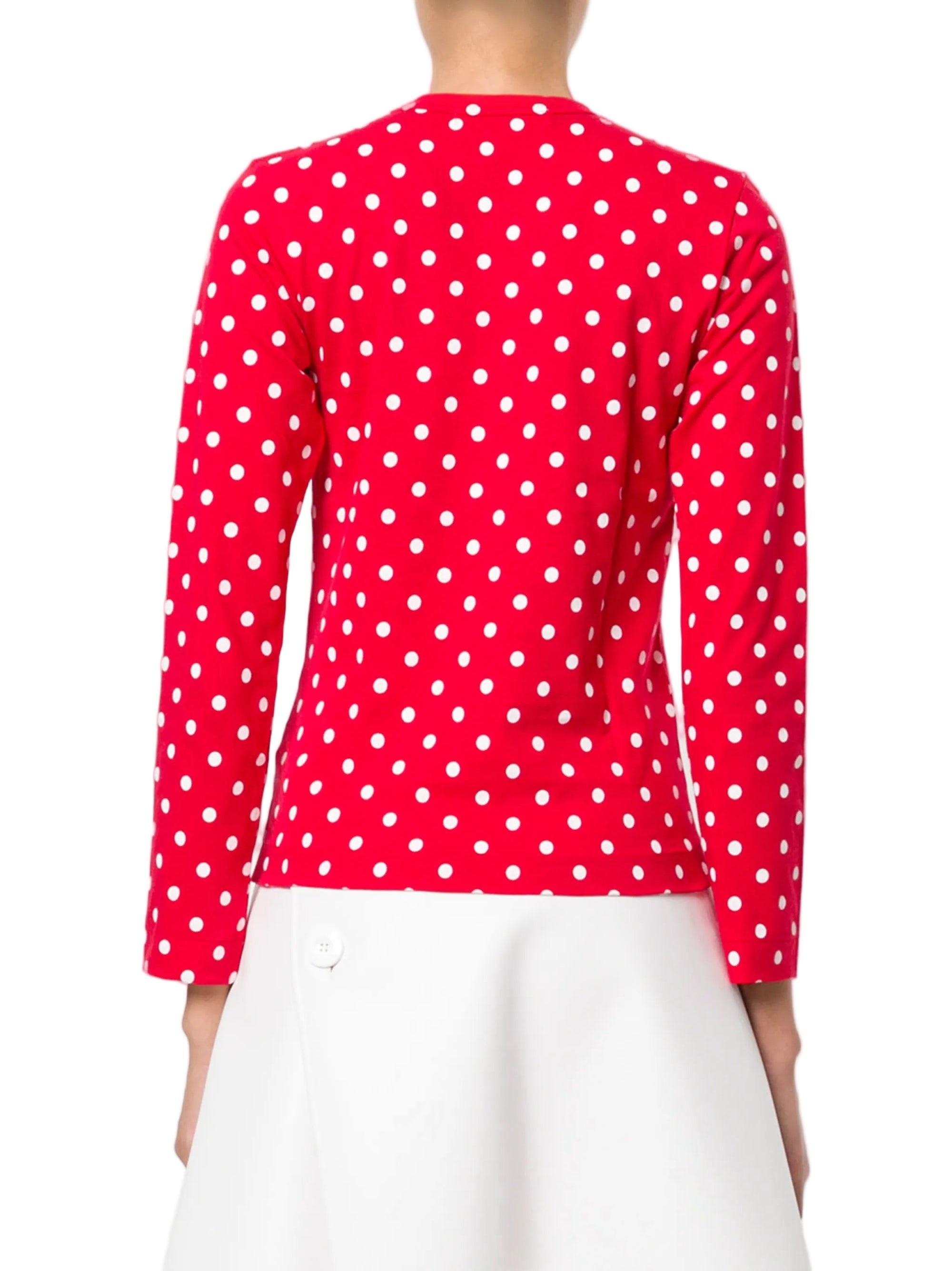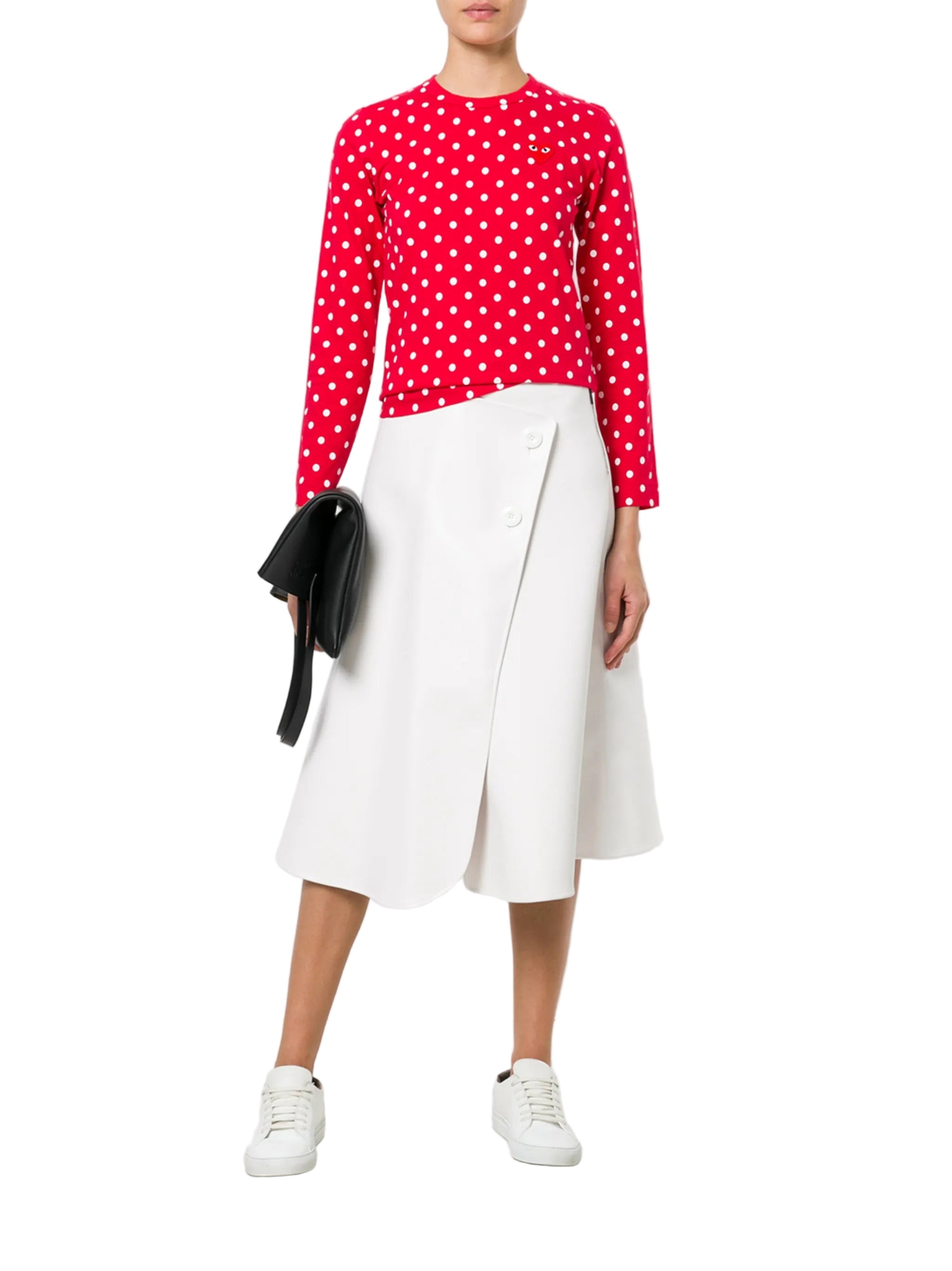 The trademark design of Comme Des Garçon Play’s playful almond-eyed red heart print is camouflaged by the white polka dot design on this red T-shirt, but look closer and see the unmistakable peepers looking out at you. This cotton long sleeve top from Comme Des Garçons Play also features a crew neck and a straight hem.