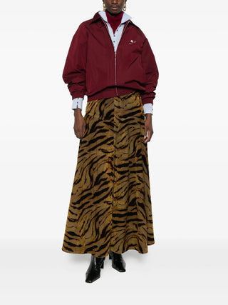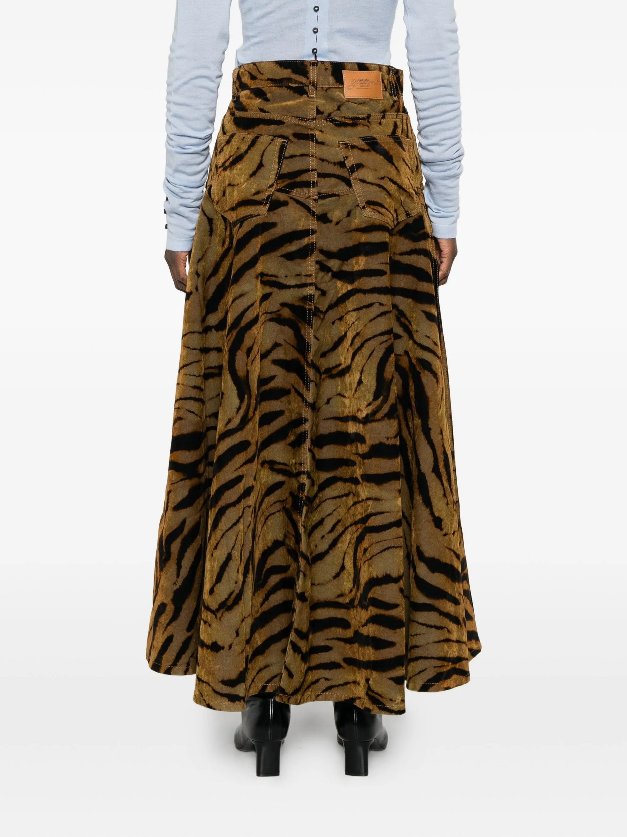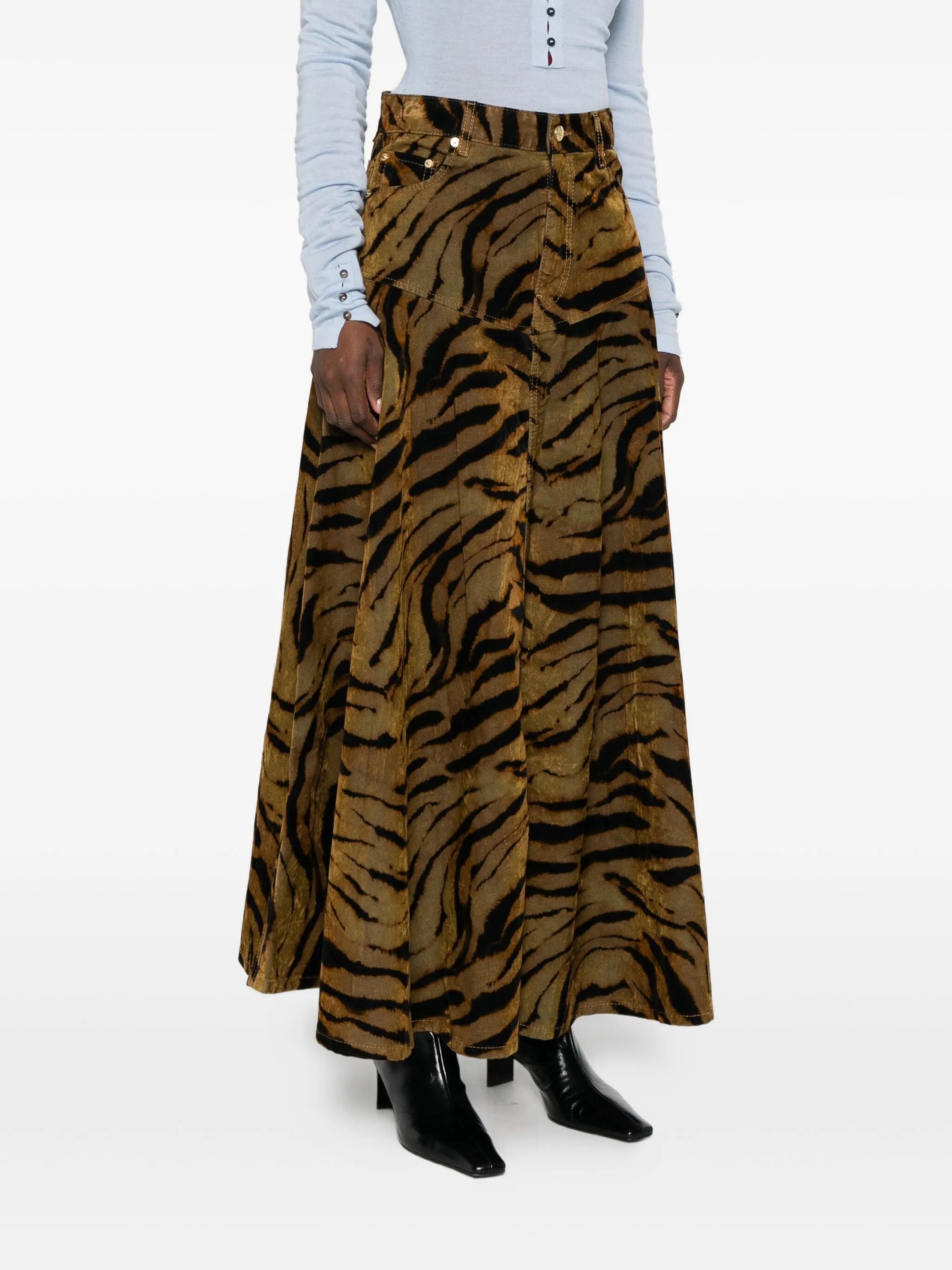 HighlightsBrownAll-over tiger printGold-tone hardwarePanelled designClassic five pocketsA-line