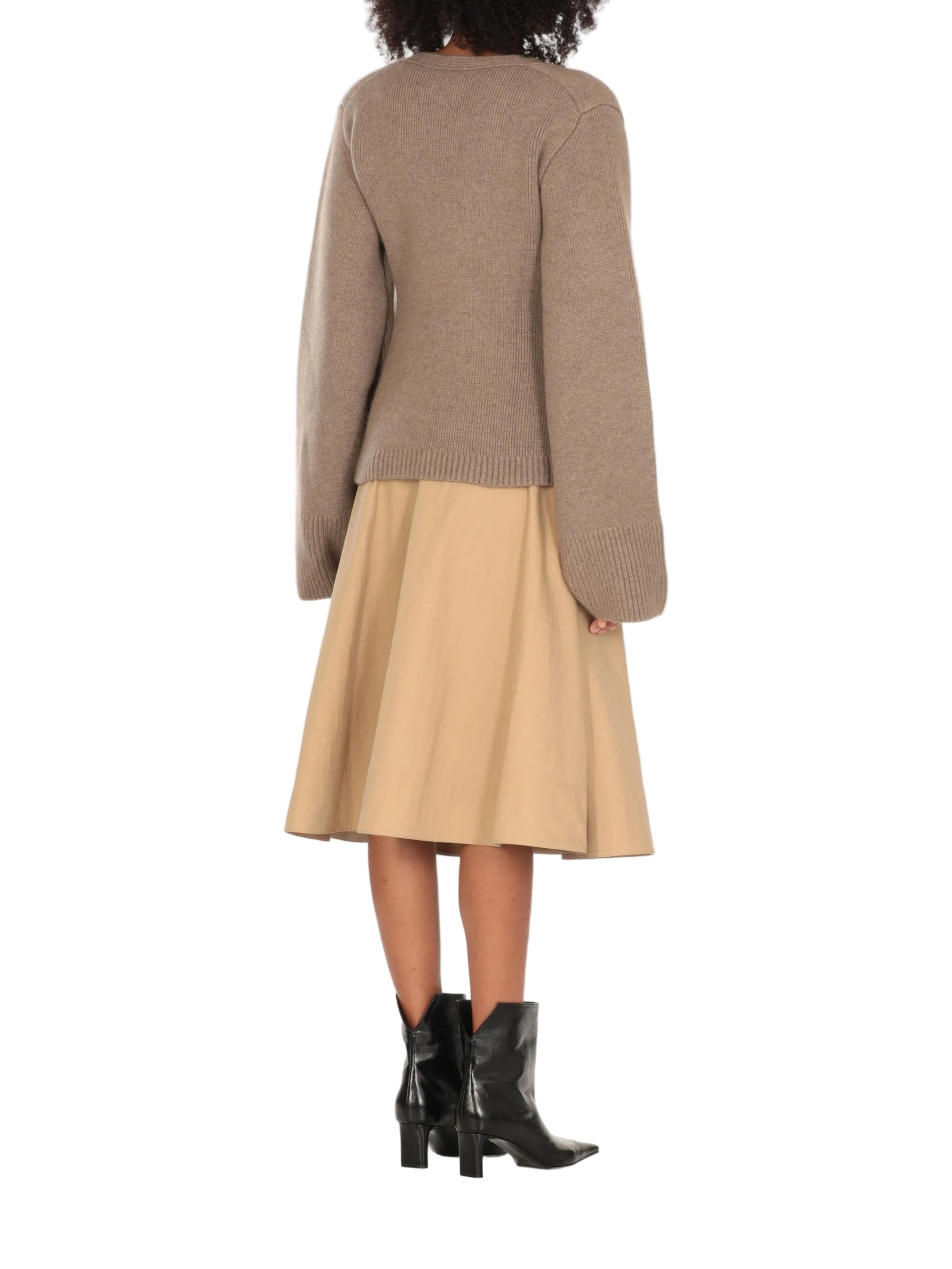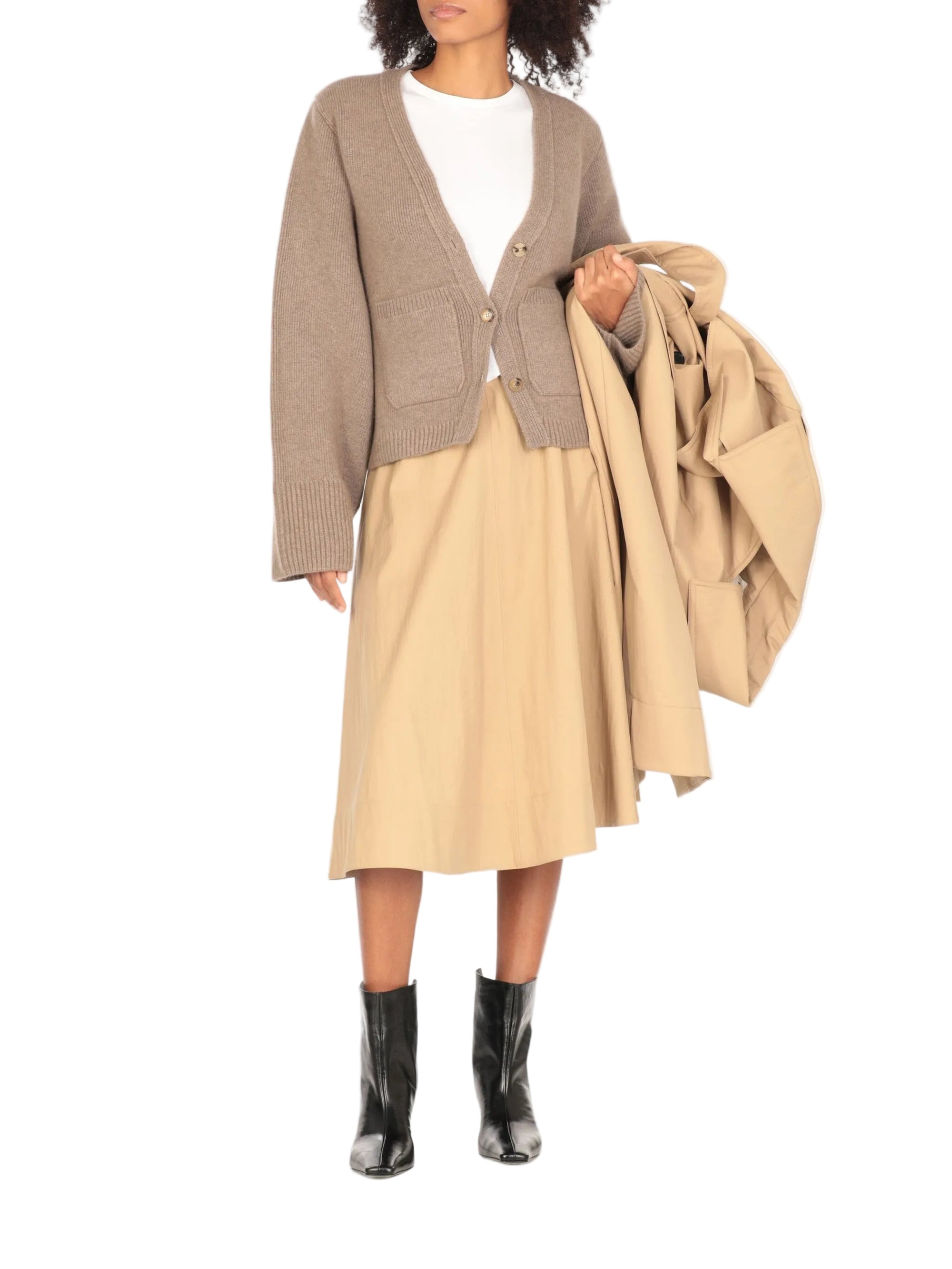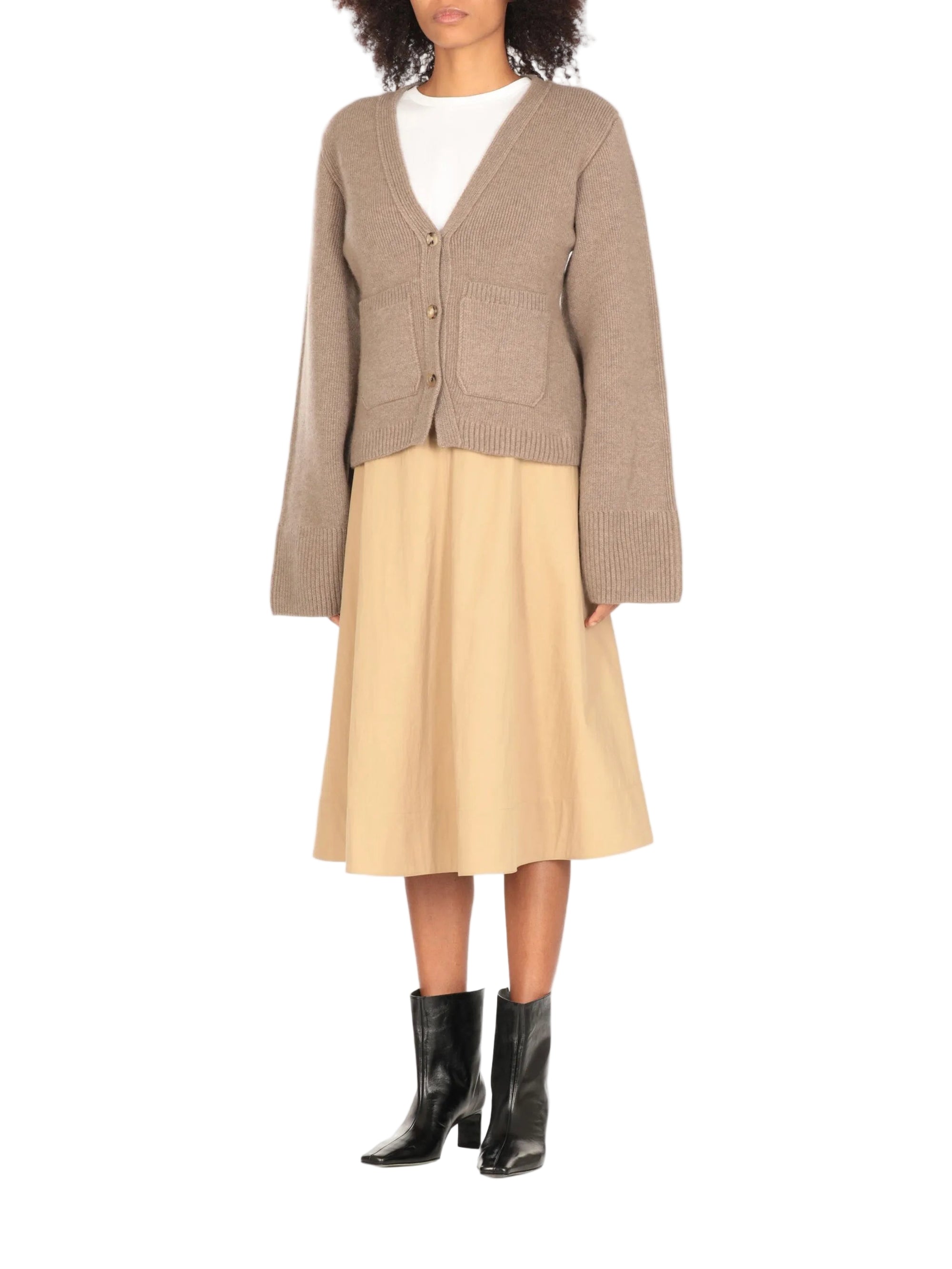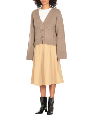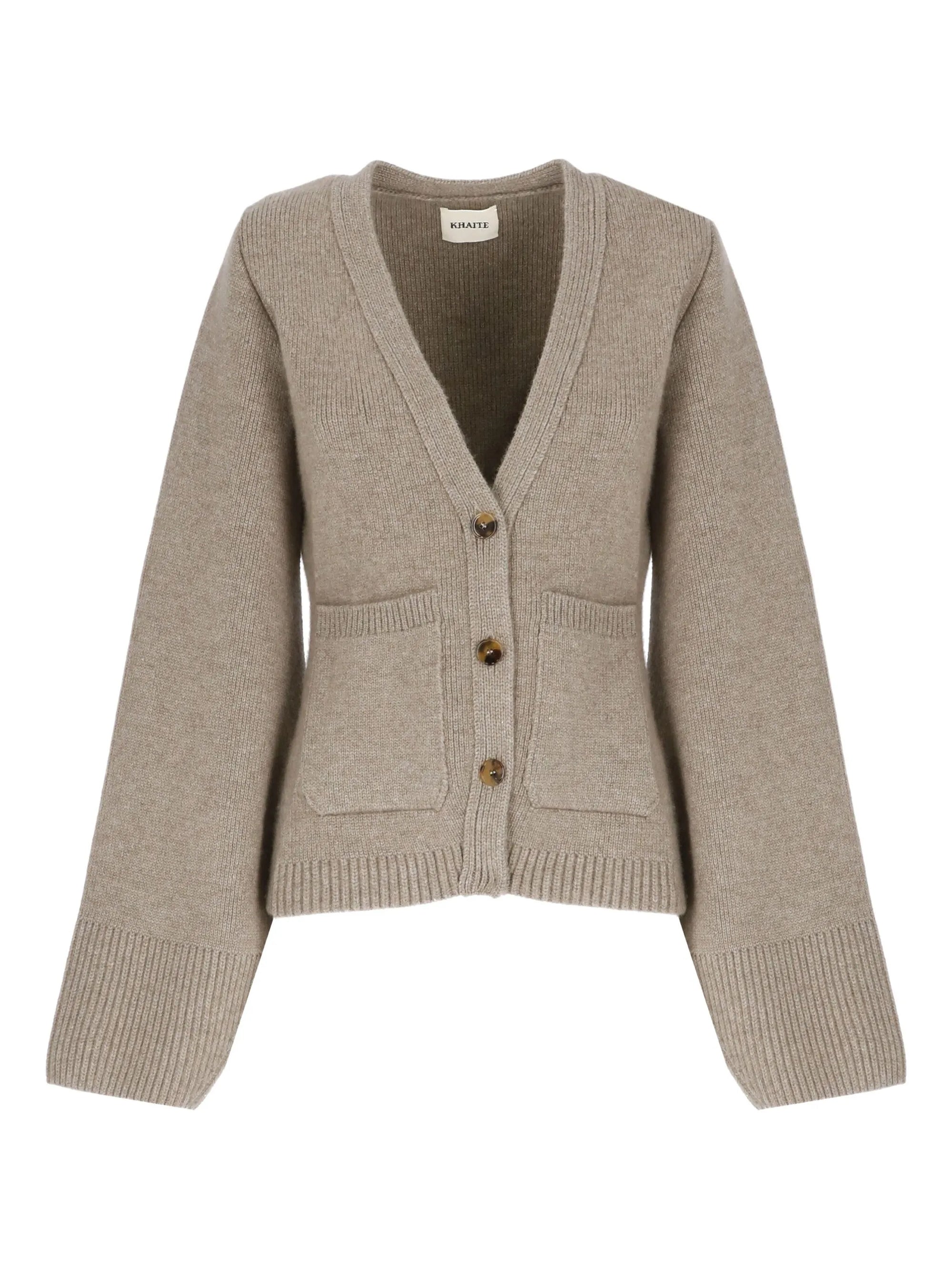 HighlightsTaupeCashmereKnitted constructionV-neckLong wide sleevesFront button fasteningTwo front patch pockets