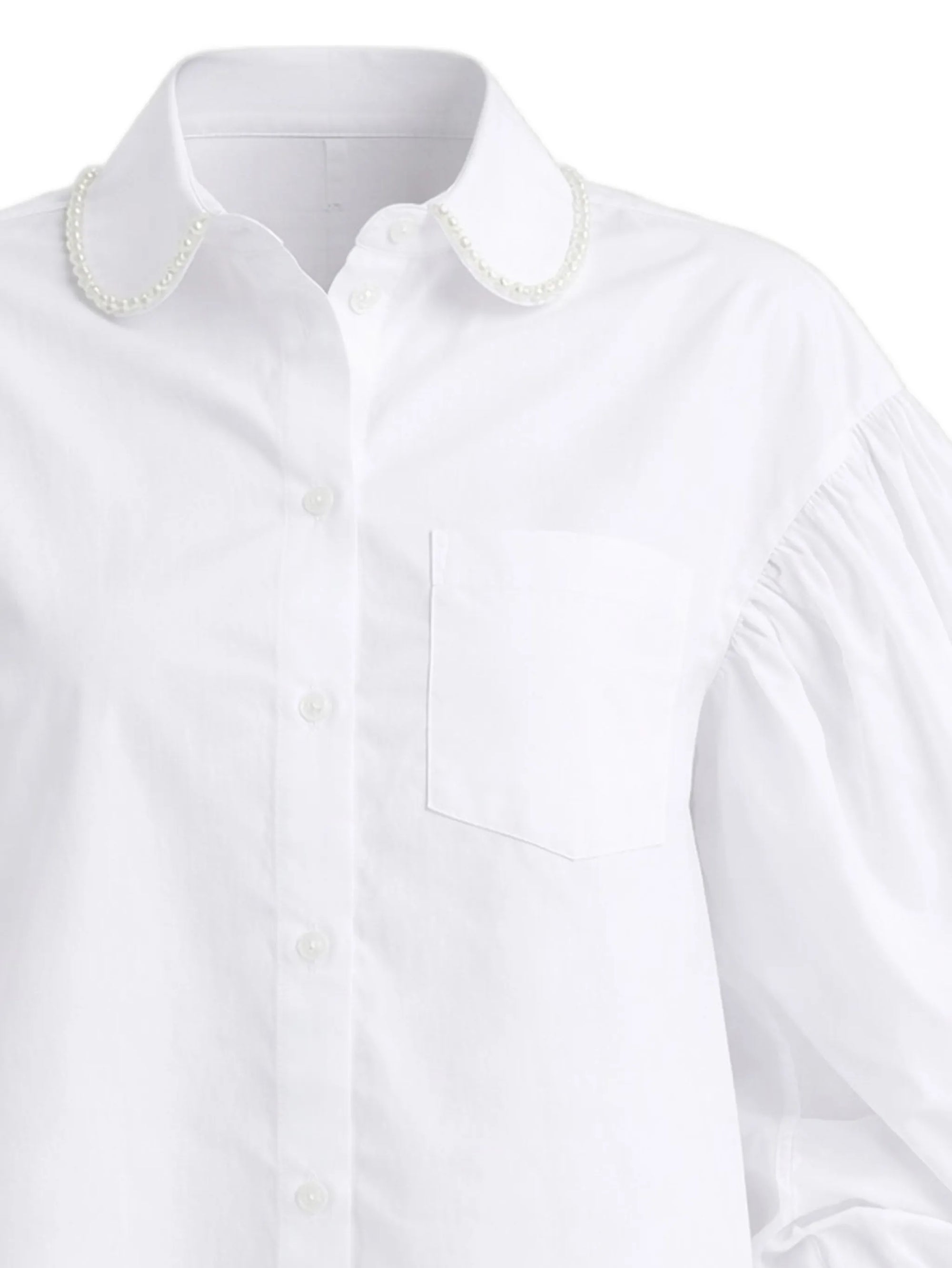 Simone Rocha’s white boxy draped sleeve round collar shirt offers a refined take on everyday tailoring. Designed in a boxy fit, it features a round collar with subtle pearl embellishment, a chest patch pocket, and a clean front button fastening. Draped sleeves add soft volume and movement, giving the piece a modern, romantic edge. Wear it with tailored trousers or a soft skirt for an elevated daytime look — available at our Lisbon store.