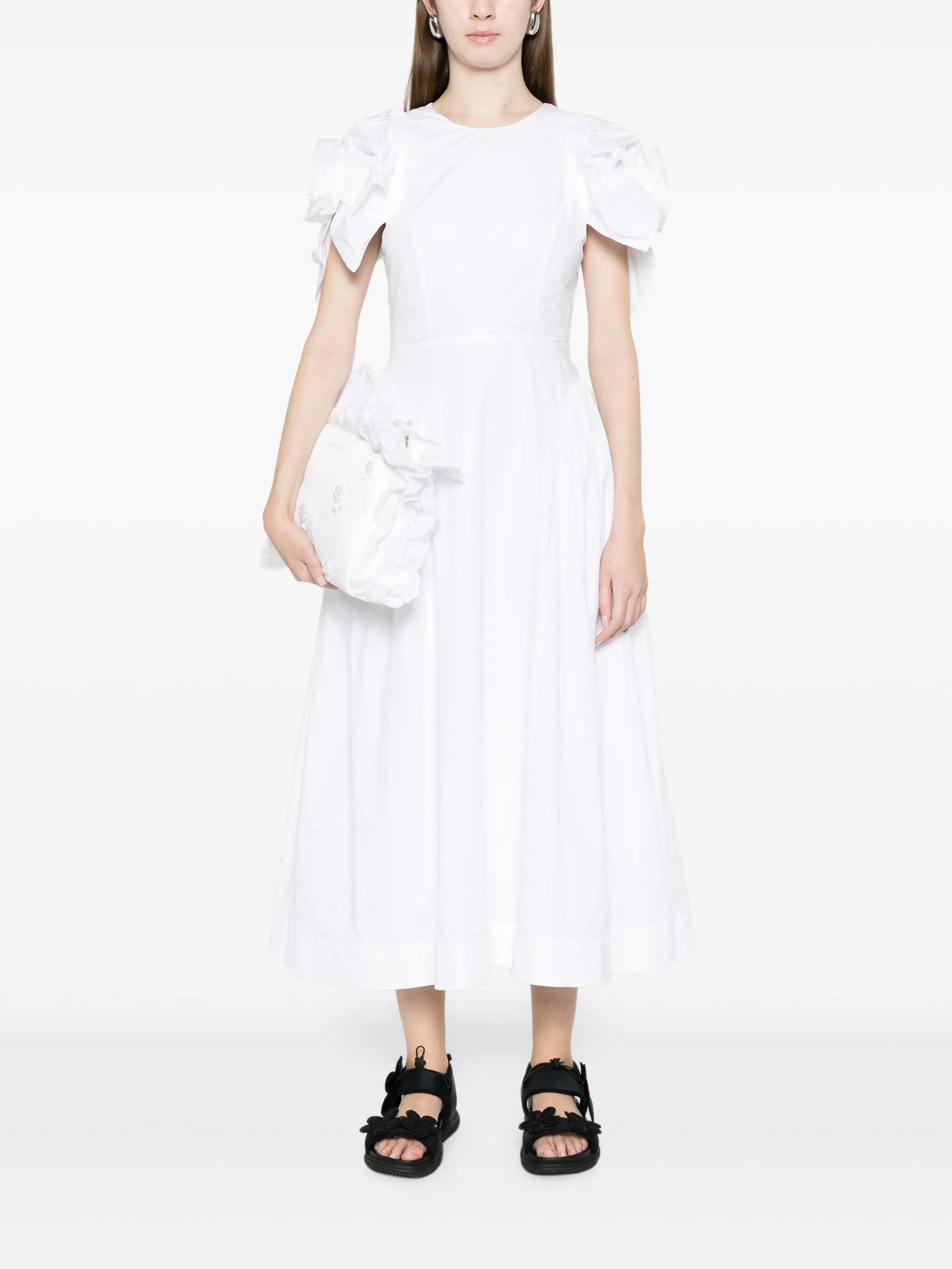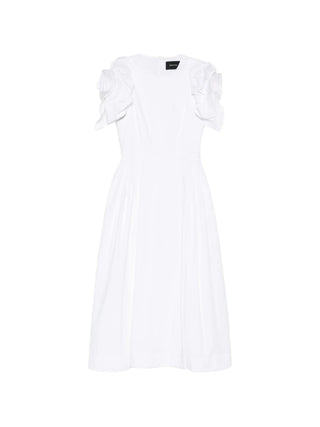 Simone Rocha’s white rose puff sleeve hip dress is a study in modern romance and refined tailoring. Designed with softly ruffled sleeves and an A-line silhouette, it features a crew neckline and a pleated skirt that moves elegantly with every step. The rear zip fastening ensures a neat fit while maintaining comfort. Perfect for formal occasions or elevated daywear — available at our Lisbon store.