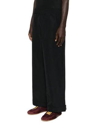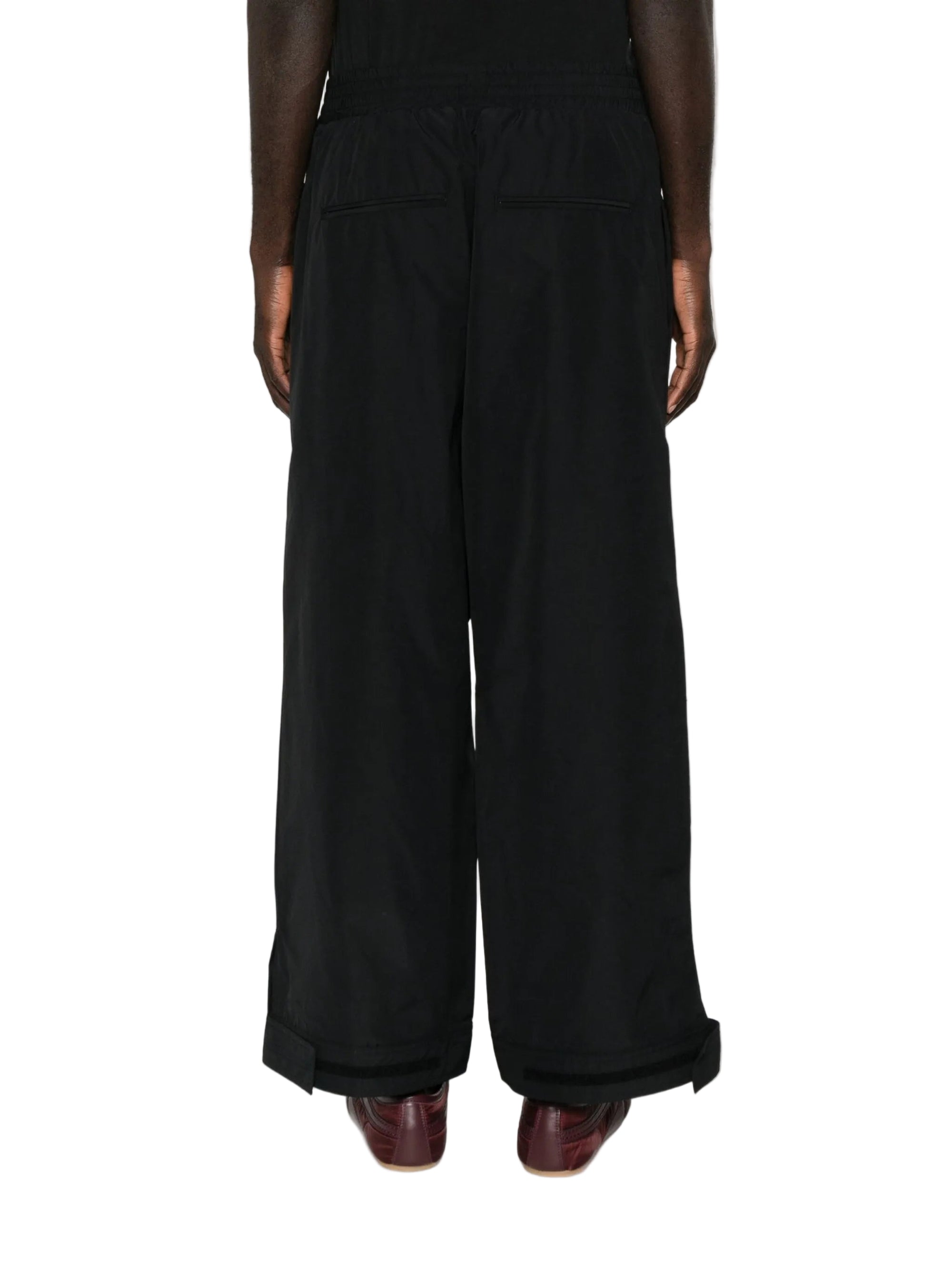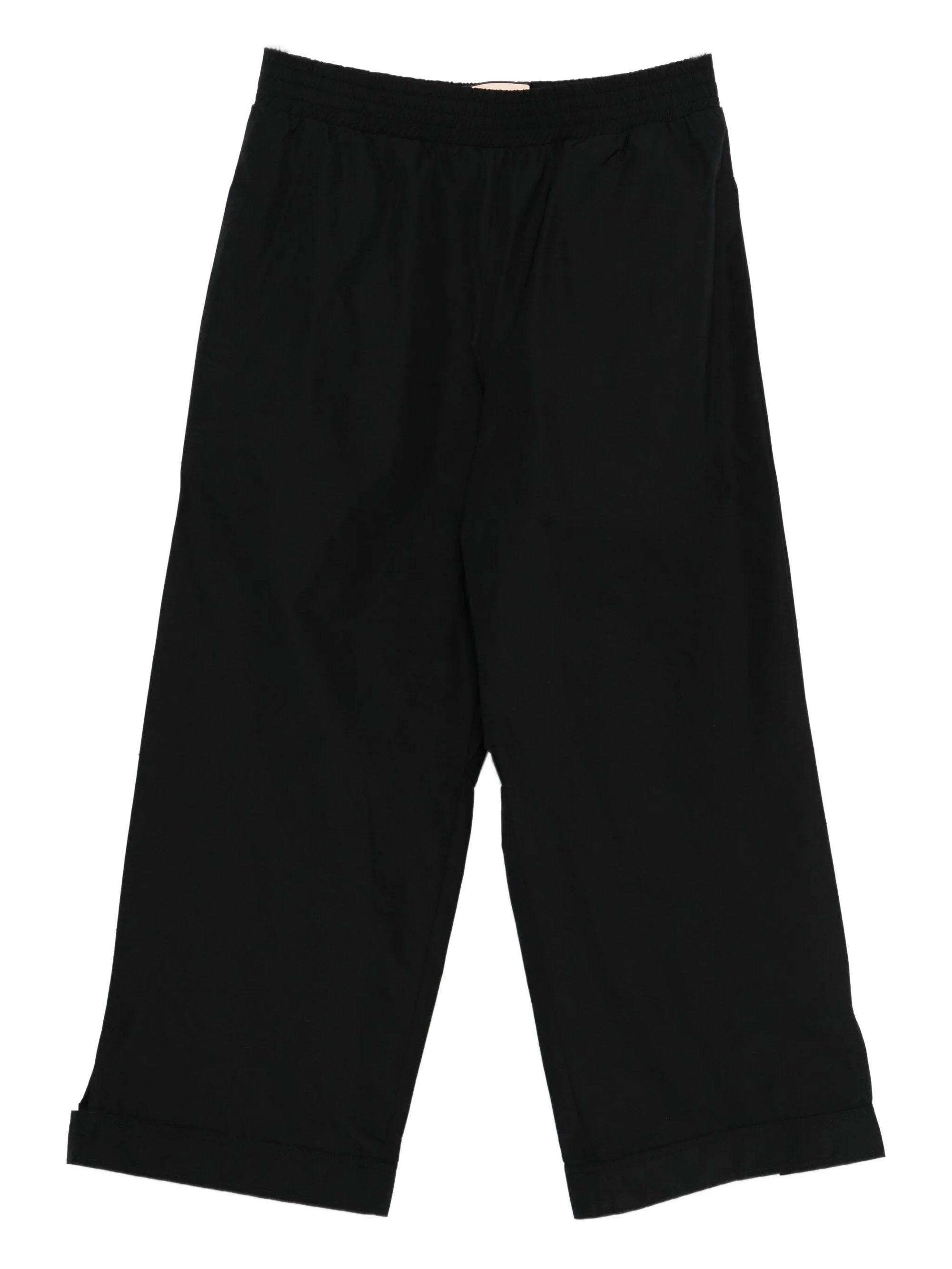 HighlightsBlackElasticated waistbandTurn-up hemsSide-seam pocketsBack welt pockets