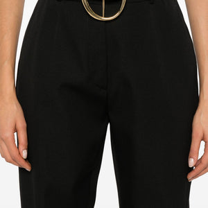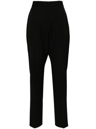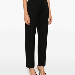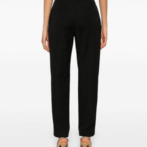 Highlights:BlackVirgin woolZip, hook and buttonhole hidden on the frontBelt loopsSplit side pocketsMarked foldsPiped back pocketsTapered cut