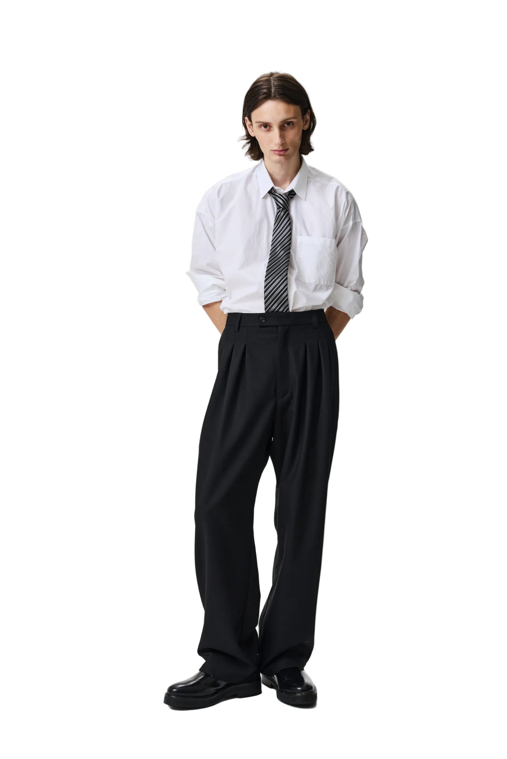 Triple pleated wide trouser with a softly tapered leg.
