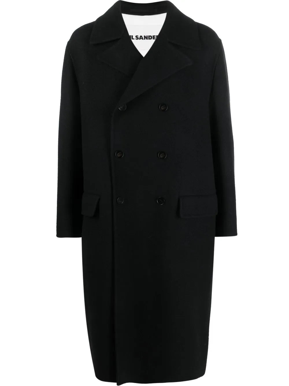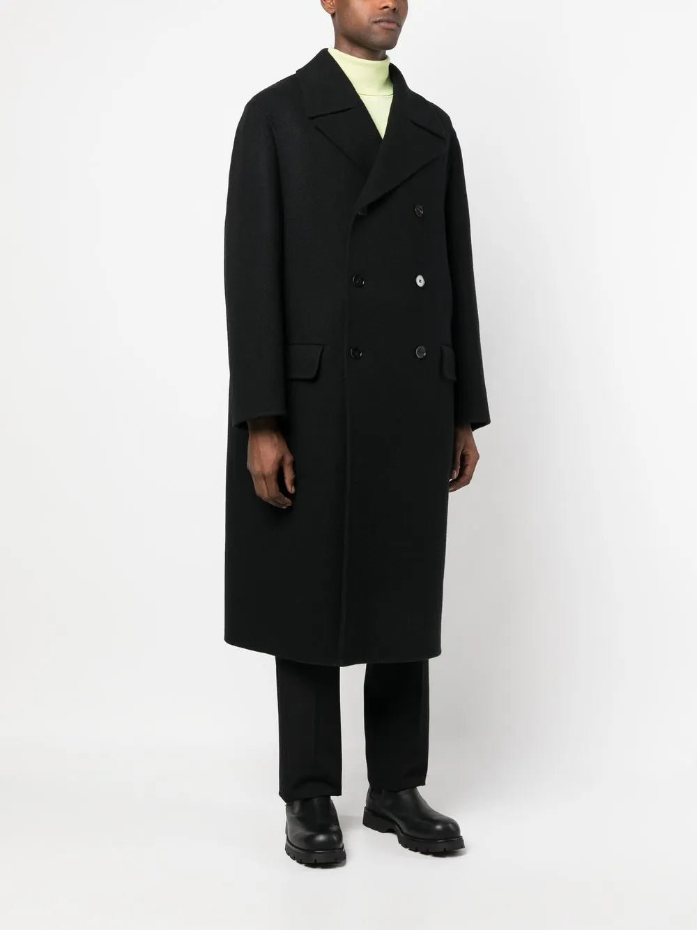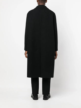 Highlights: Black Virgin wool Notched collar Double-breasted button fastening Long sleeves Two front flap pockets Partial lining